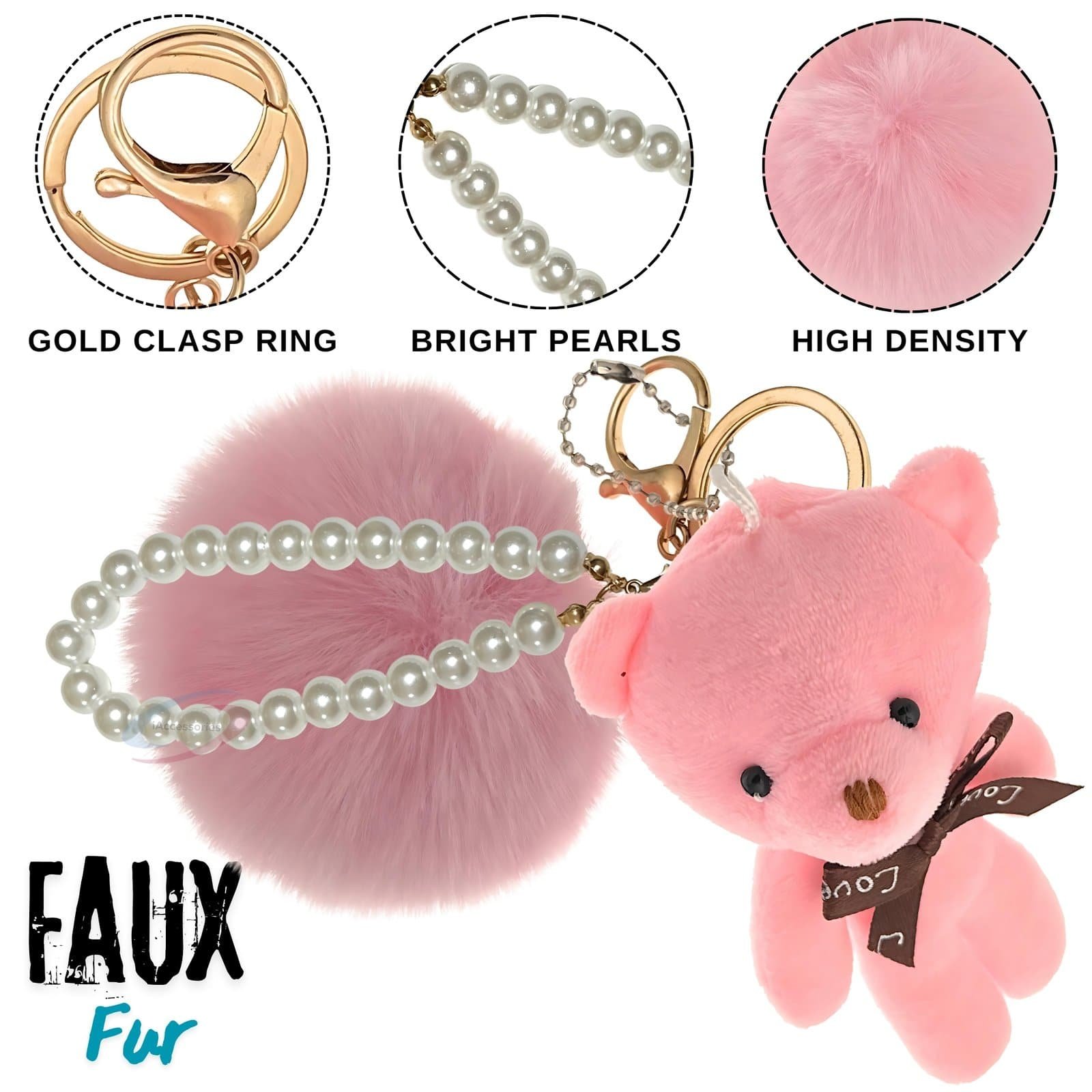The **iAccessories Fluffy Faux Fur Soft Pom Pom Teddy with Pearl Chain Keychain** is the ultimate blend of cuteness and class.