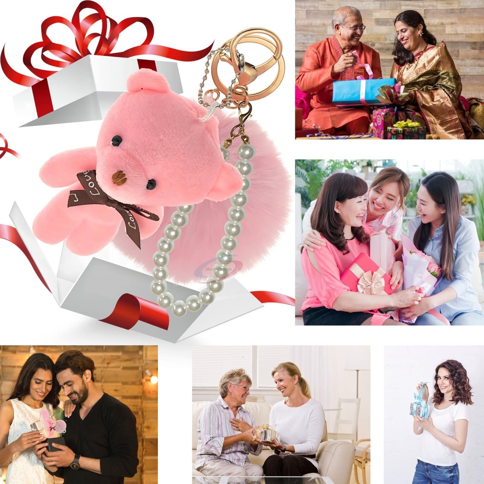 This fashionable keychain features an **adorable teddy bear design** crafted from soft faux fur in a charming **soft pink** hue. It's the perfect way to personalize your bags, scooties, bikes, cars, and home keys, adding a delightful touch of whimsy and elegance.