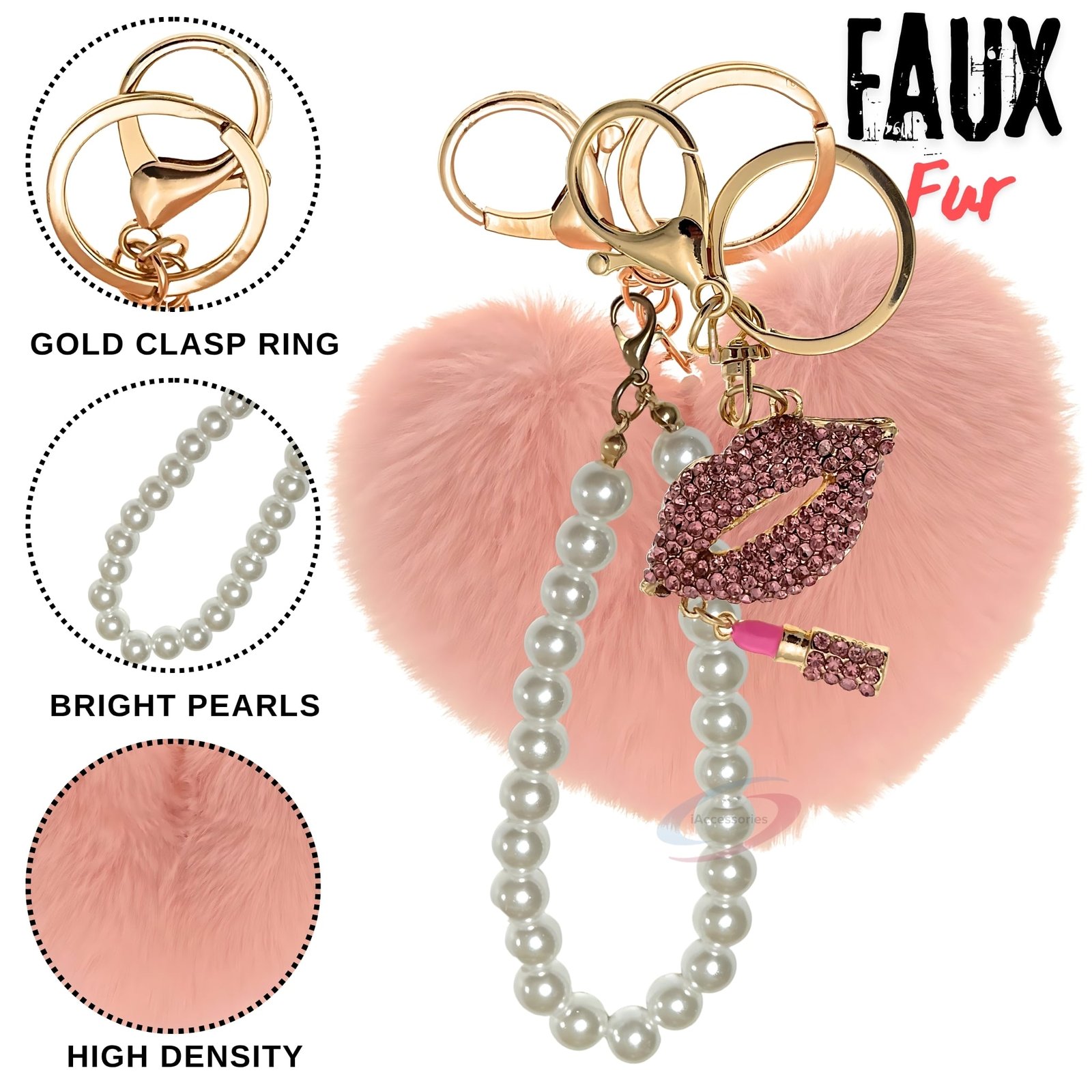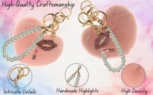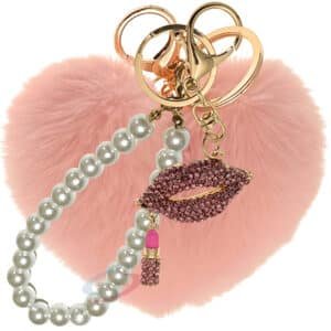 Enhance your daily style with the iAccessories Pearl Diamond Lips Heart Pom Pom Key Ring – Baby Pink.