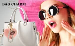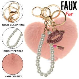 Soft, fluffy faux fur shaped into a cute heart, paired with a glamorous lips pendant studded with stones and a beautiful pearl accent — all in one stylish accessory!