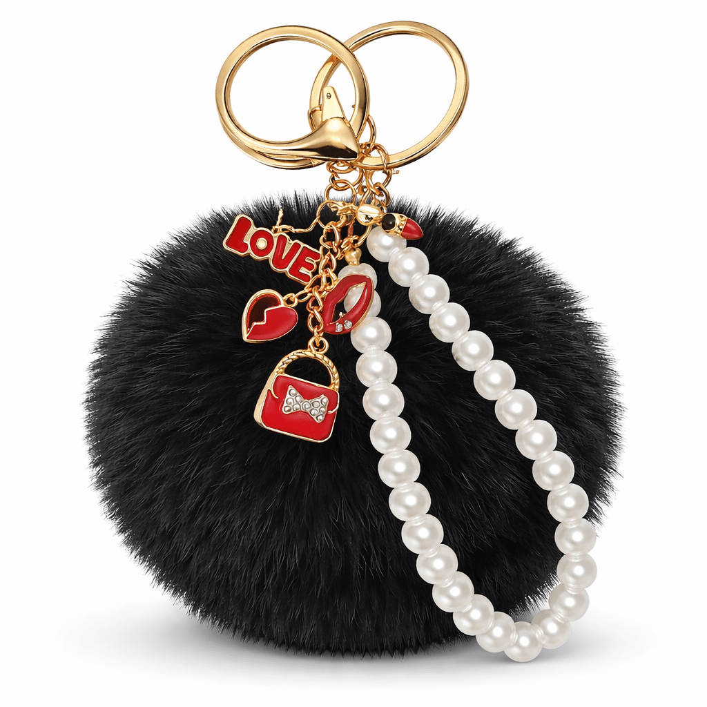 Black Fluffy Faux Fur Heart Pom Pom Keychain with Pearl – iAccessories Stylish Bag Charm for Girls