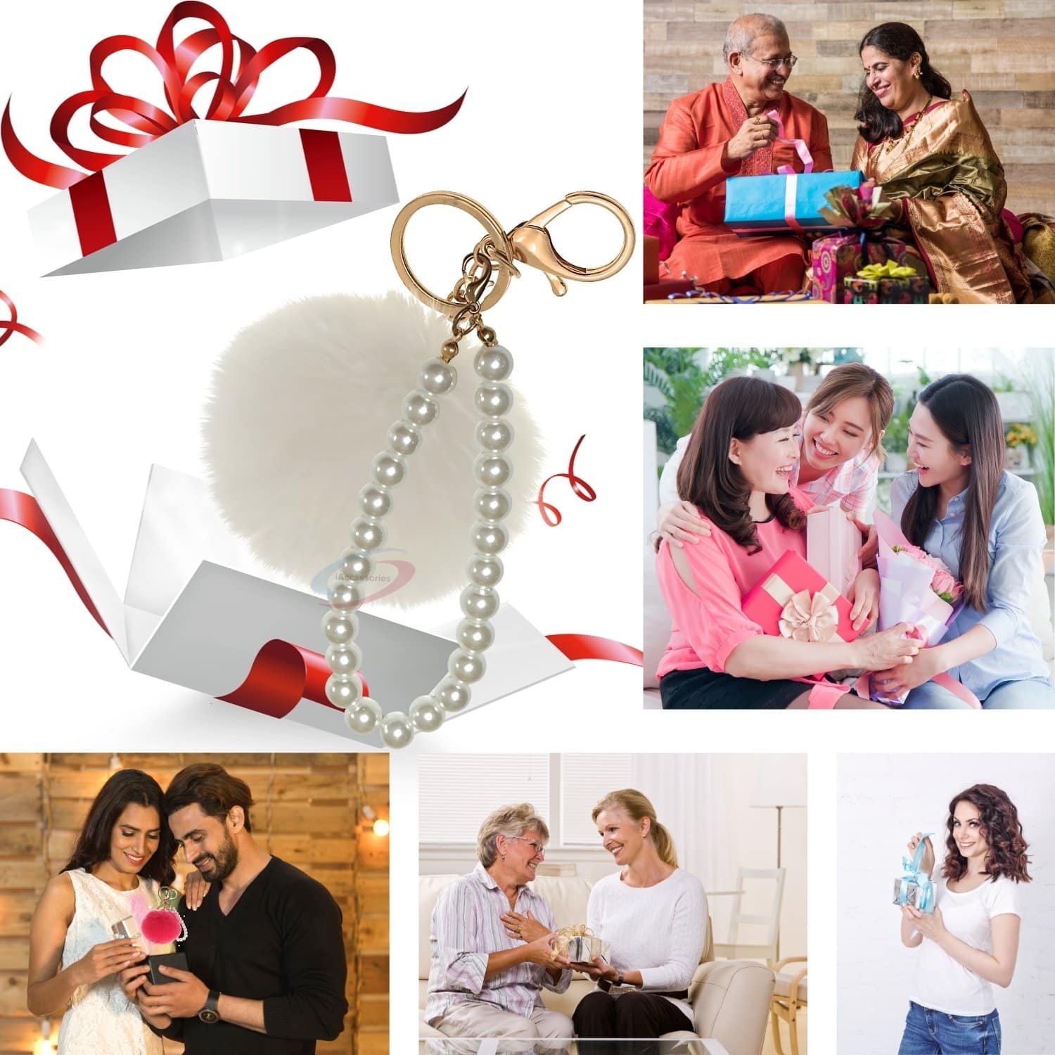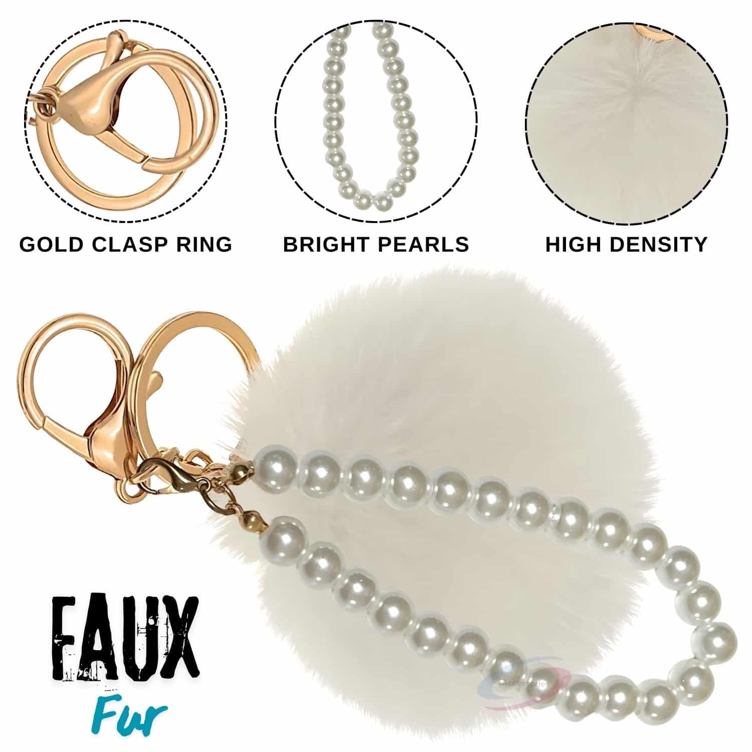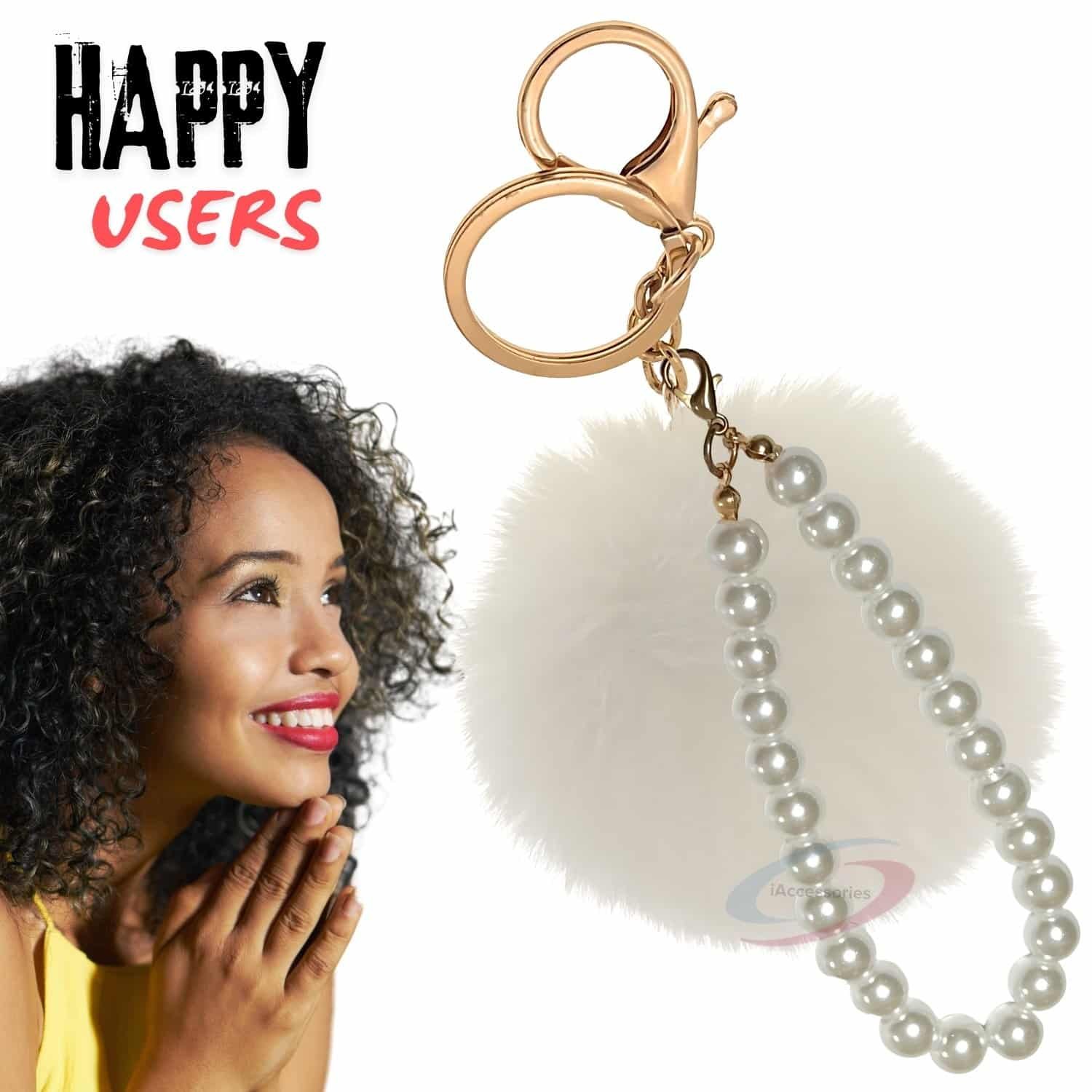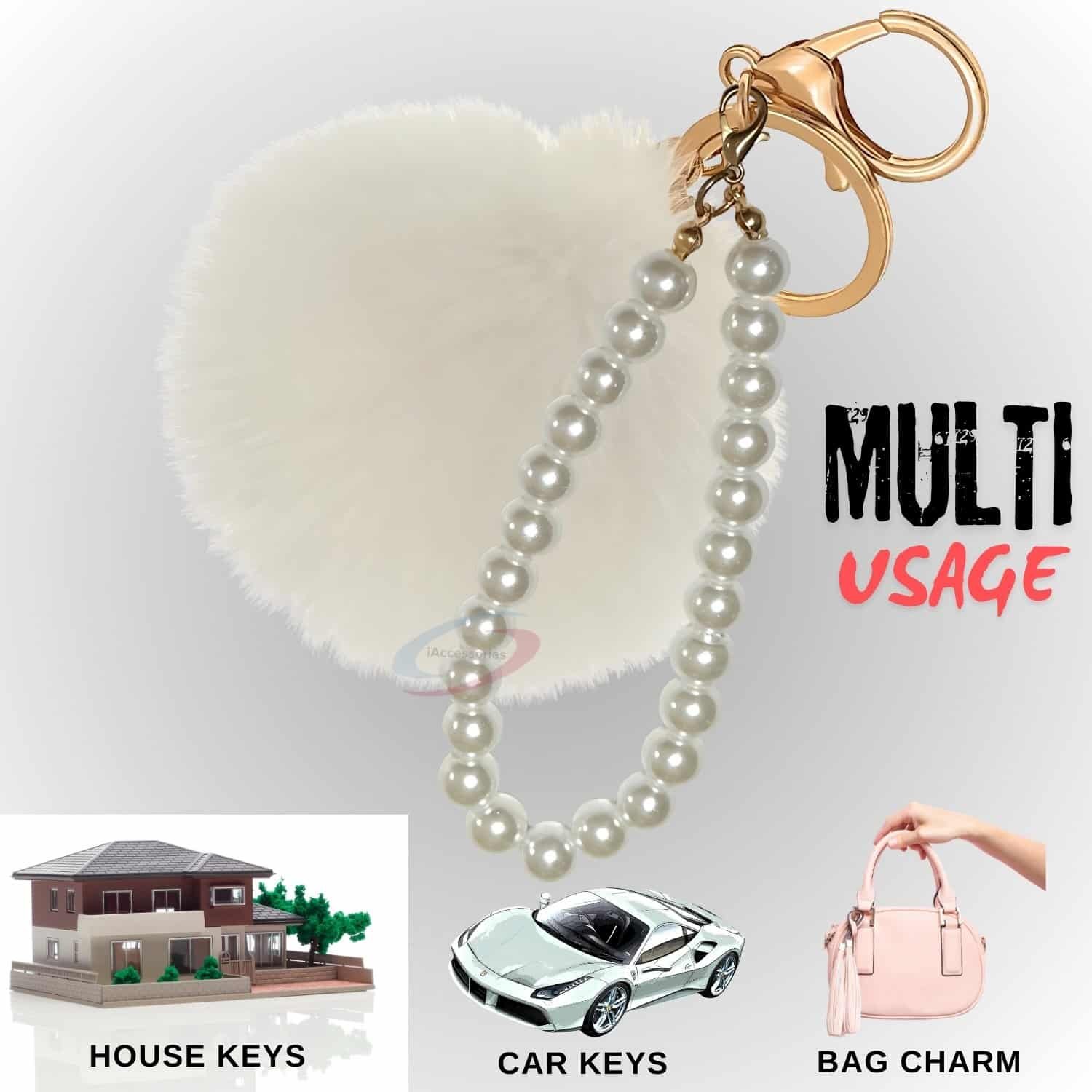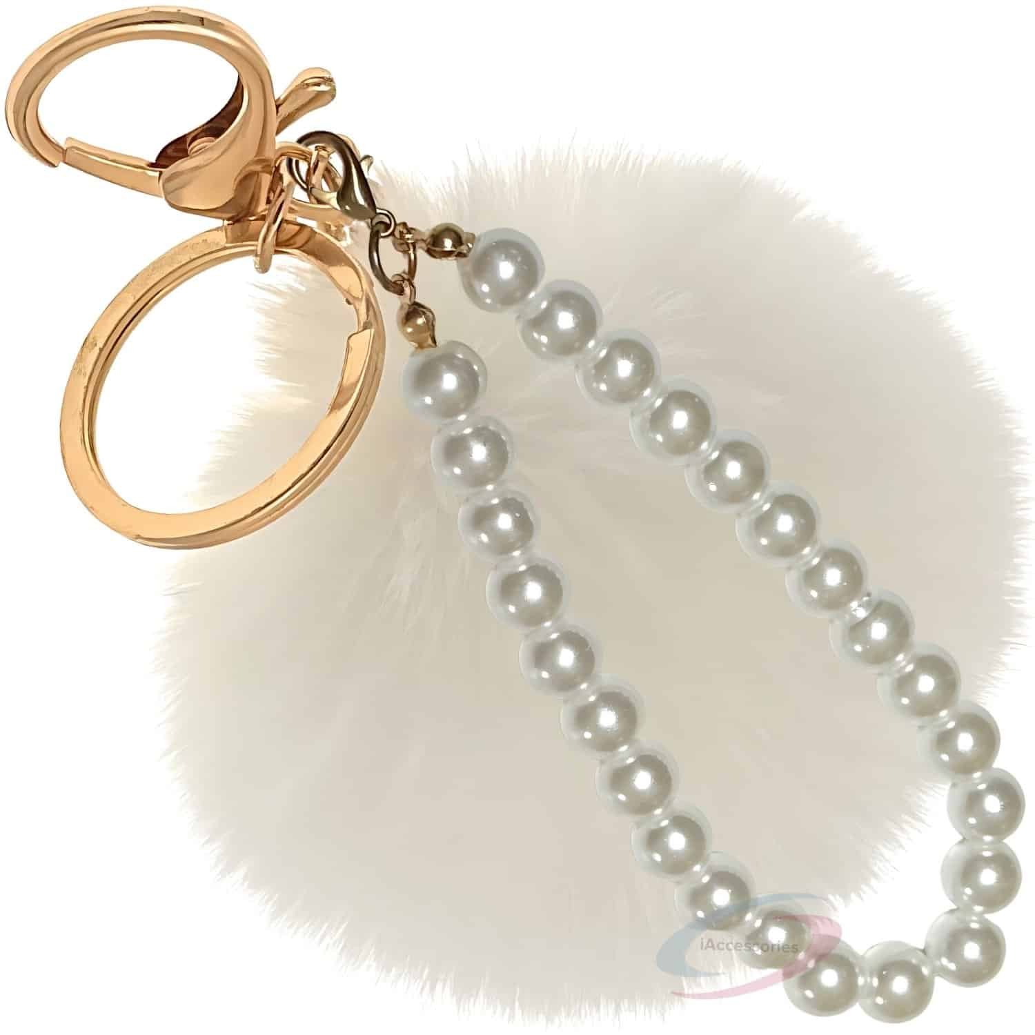 Tired of plain keys or boring bags? Instantly elevate your accessory game with the **iAccessories Faux Fur Pompom with Pearls Keychain Charm** in elegant White.