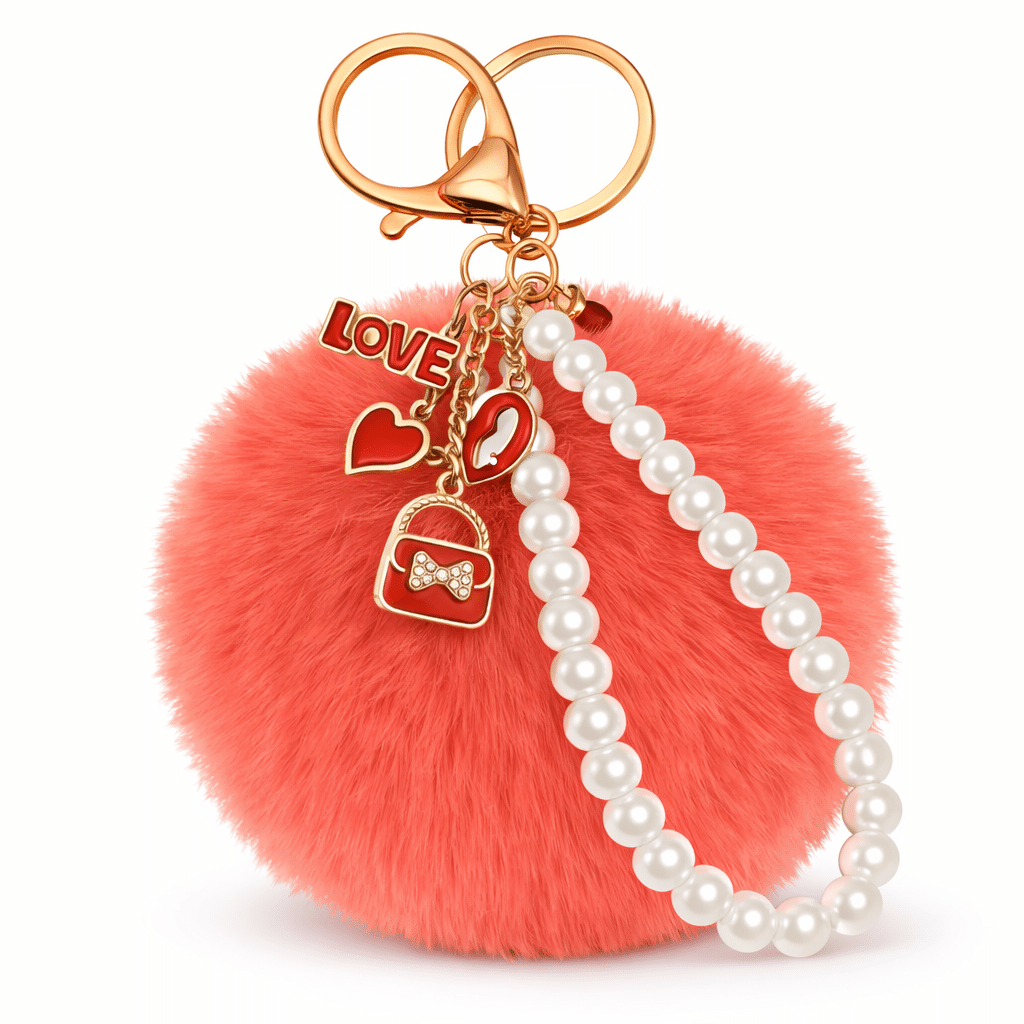 Bring vibrance and cuteness to your everyday style with the iAccessories Fluffy Faux Fur Pearl Fashion Pom Pom Keychain – Coral.