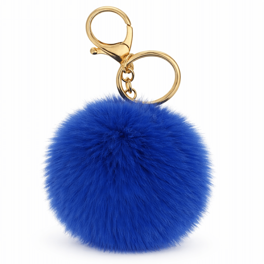 Add a classy and modern accent to your everyday accessories with the iAccessories Fluffy Faux Fur Pom Pom Ball Key Ring – Dark Blue.