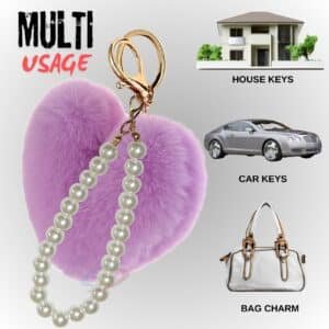 The fashionable heart-shaped faux fur pompom in light purple, coupled with an elegant **pearls pendant**, adds a stylish and romantic touch to your accessories.