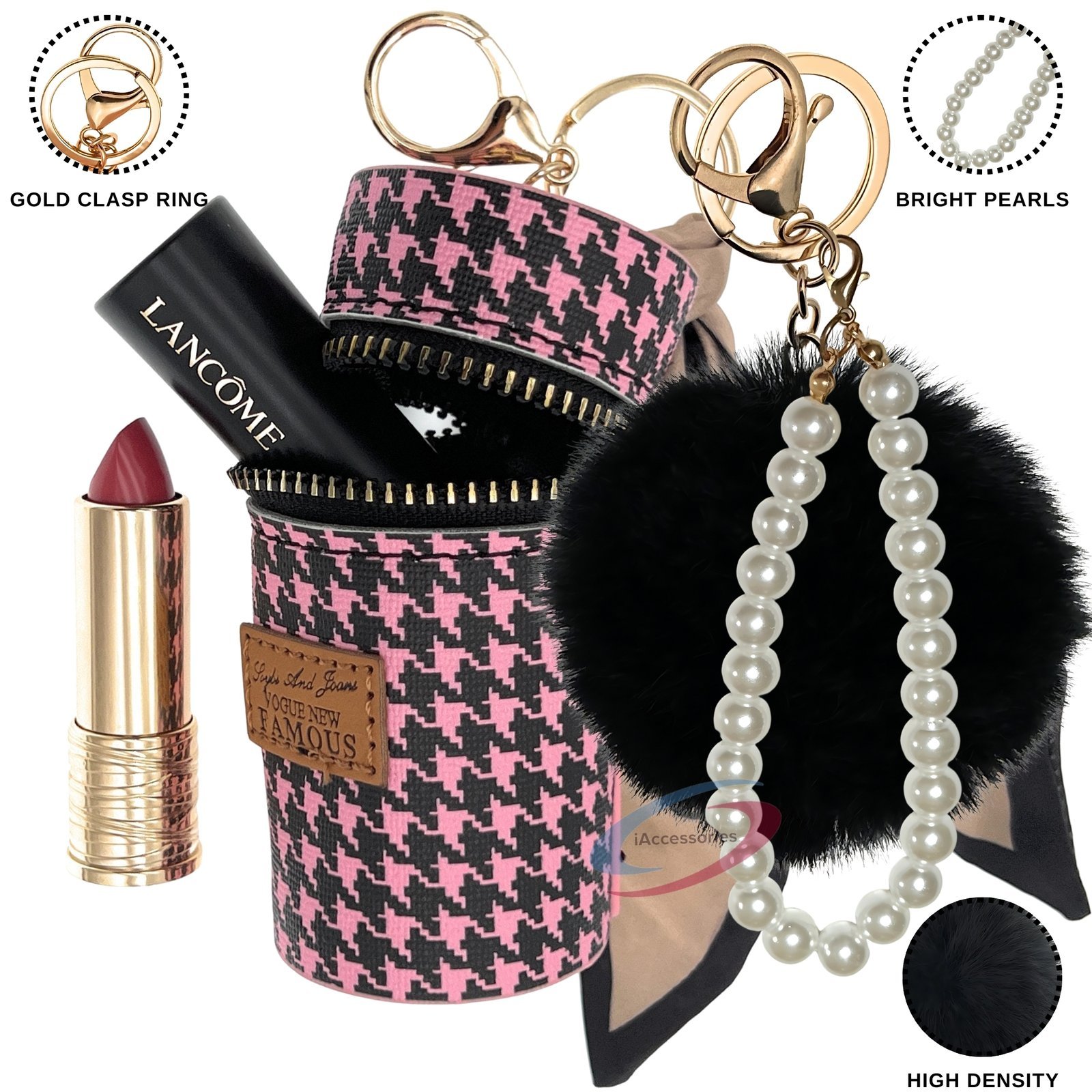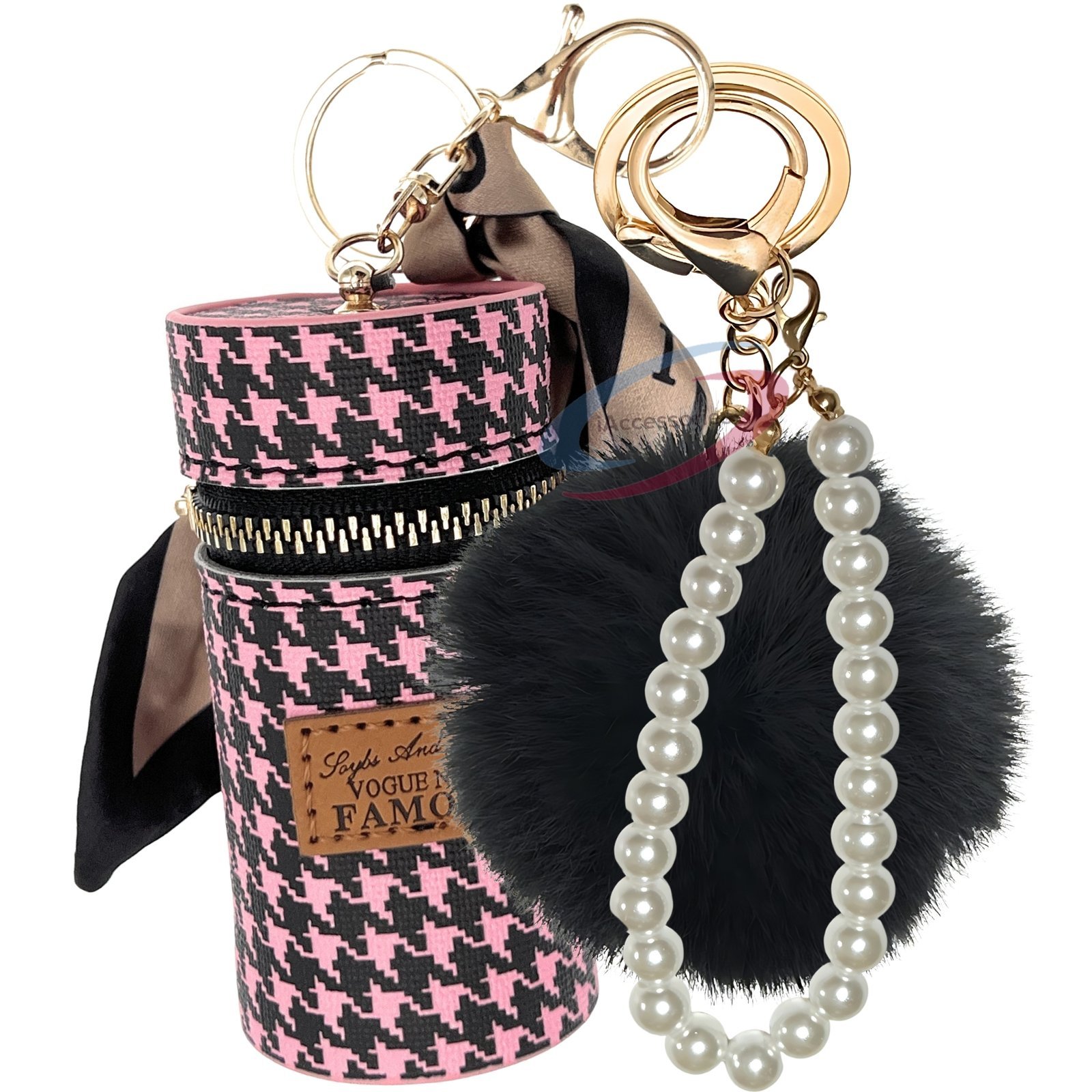 Elevate your accessory game with the **iAccessories Faux Fur Pom Pom Ball Pearl Pendant Keychain Charm** in a fashionable pink | black hue.