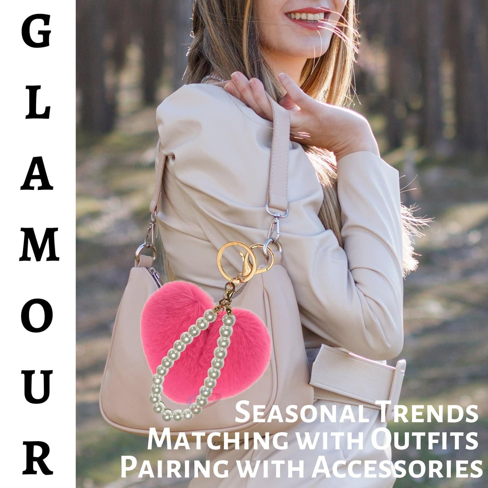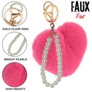 The fashionable heart-shaped faux fur pompom in **hot pink**, coupled with an elegant **pearls pendant**, adds a stylish and romantic touch to your accessories.