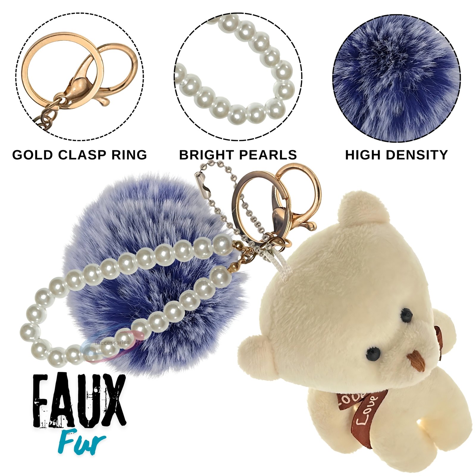 Frosted Blue-White Teddy Pom Pom Fluffy Key Ring – Cute Pearl Charm by iAccessories