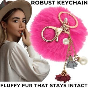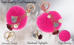 Add a bold and fashionable pop of color to your accessories with the iAccessories Fluffy Faux Fur Pearls and Roses Pom Pom Key Ring – Hot Pink.