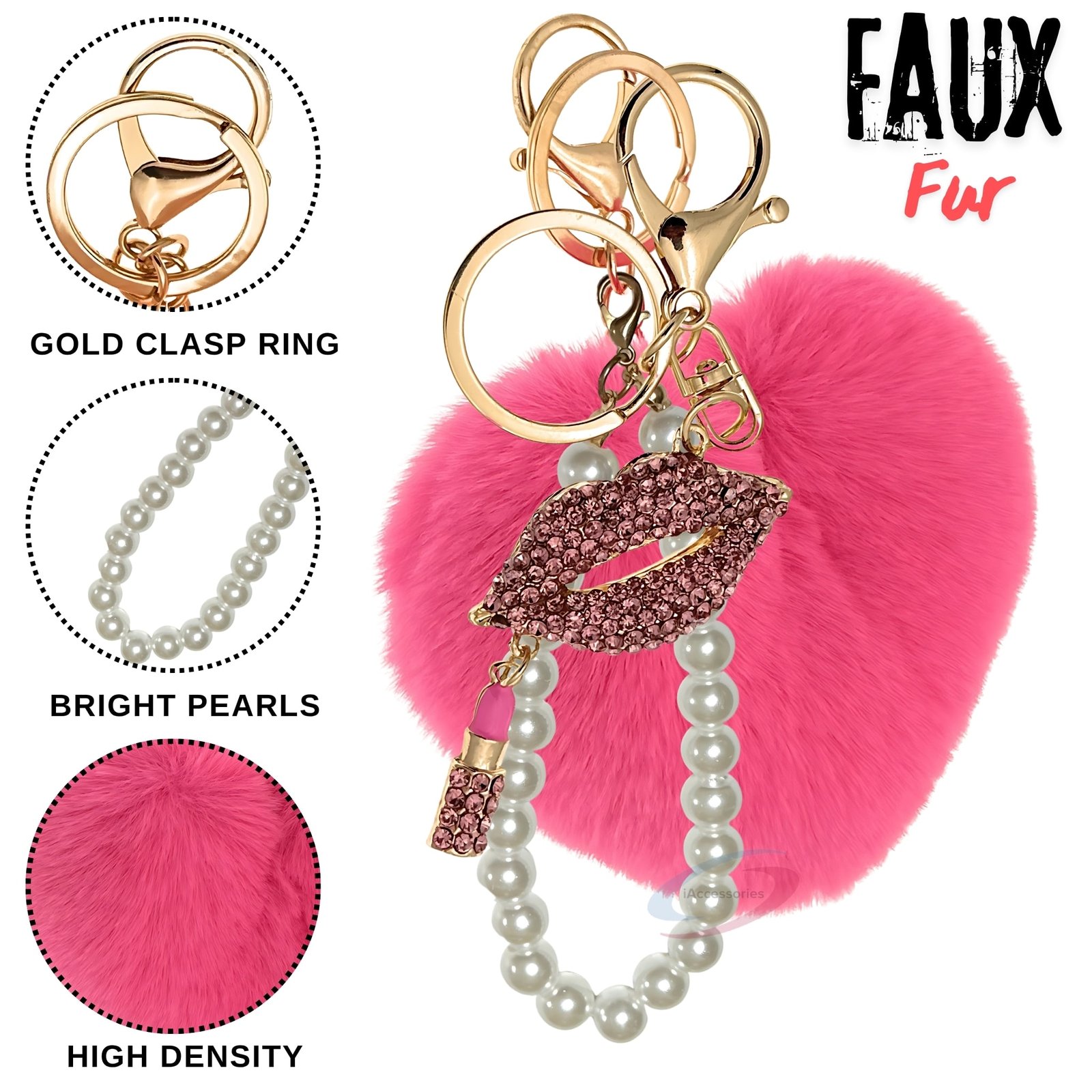 Hot Pink Fluffy Faux Fur Heart Pom Pom Keychain with Pearl & Diamond Lips – iAccessories Bag Charm for Girls