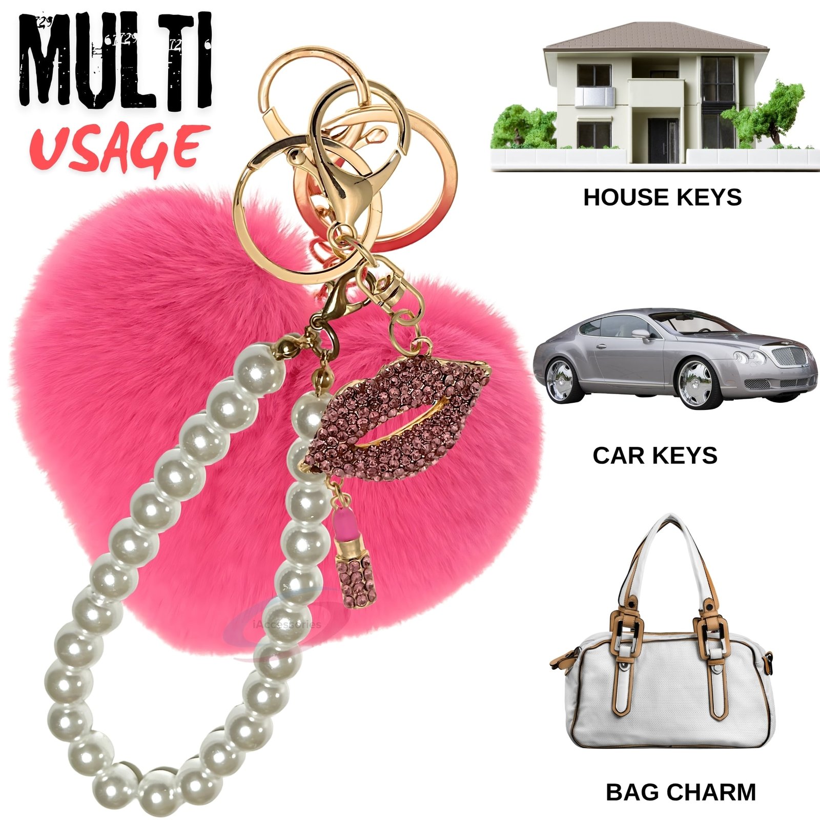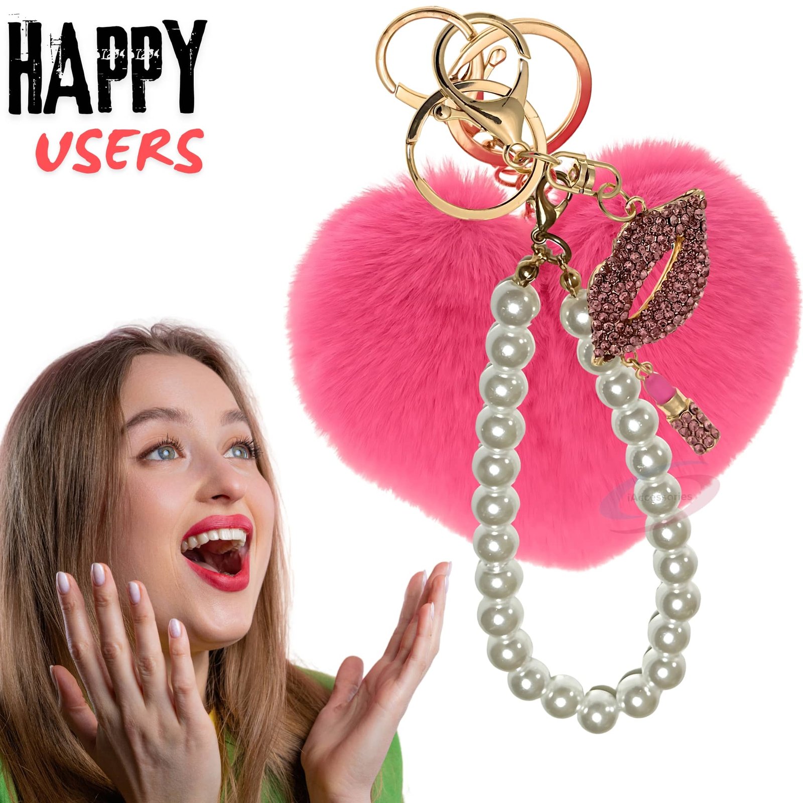 The **iAccessories Pearl Diamond Lips Fluffy Faux Fur Pom Pom Heart Key Ring – Hot Pink** is a blend of elegance, sparkle, and cuteness.