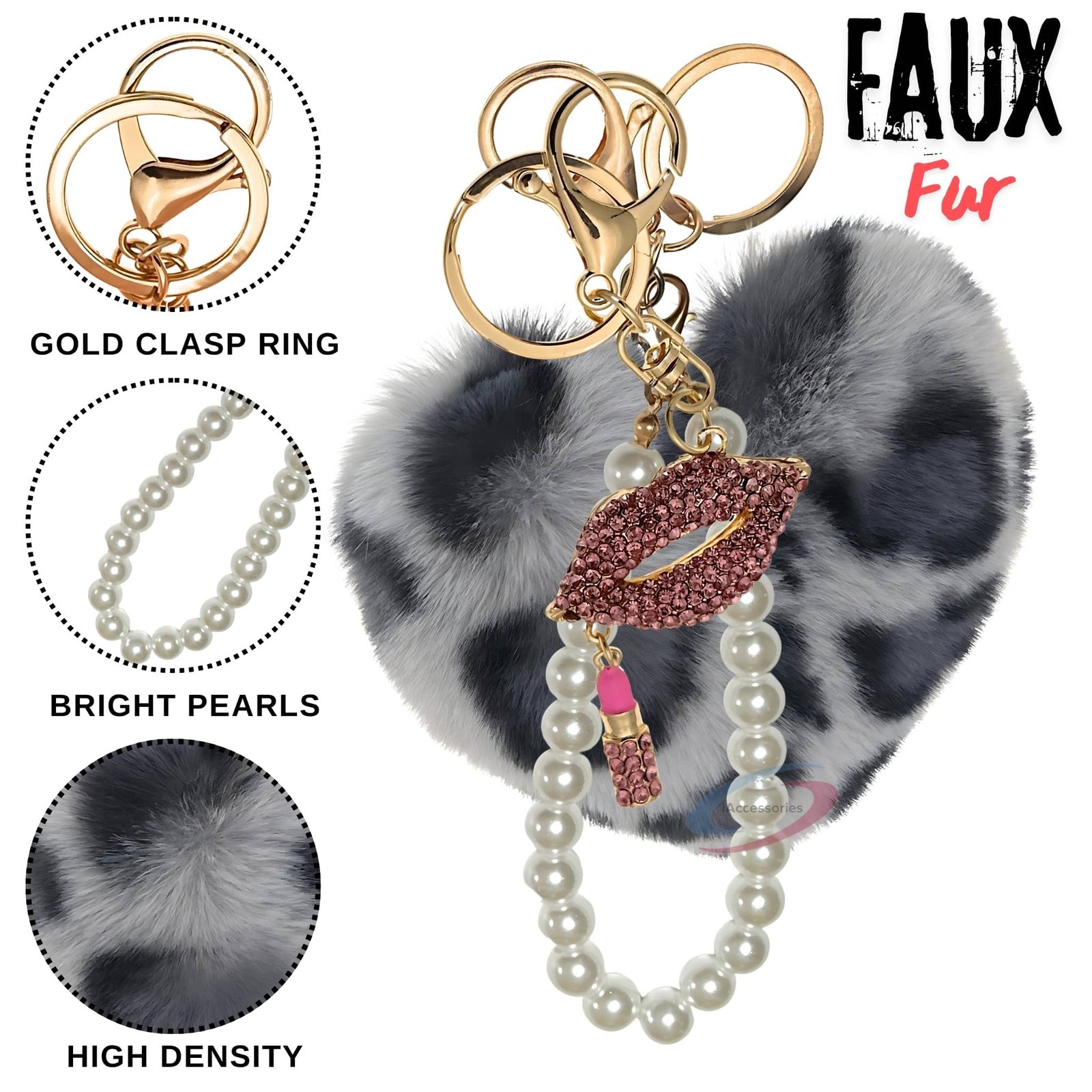 iAccessories Pearl Diamond Lips Fluffy Faux Fur Heart Key Ring