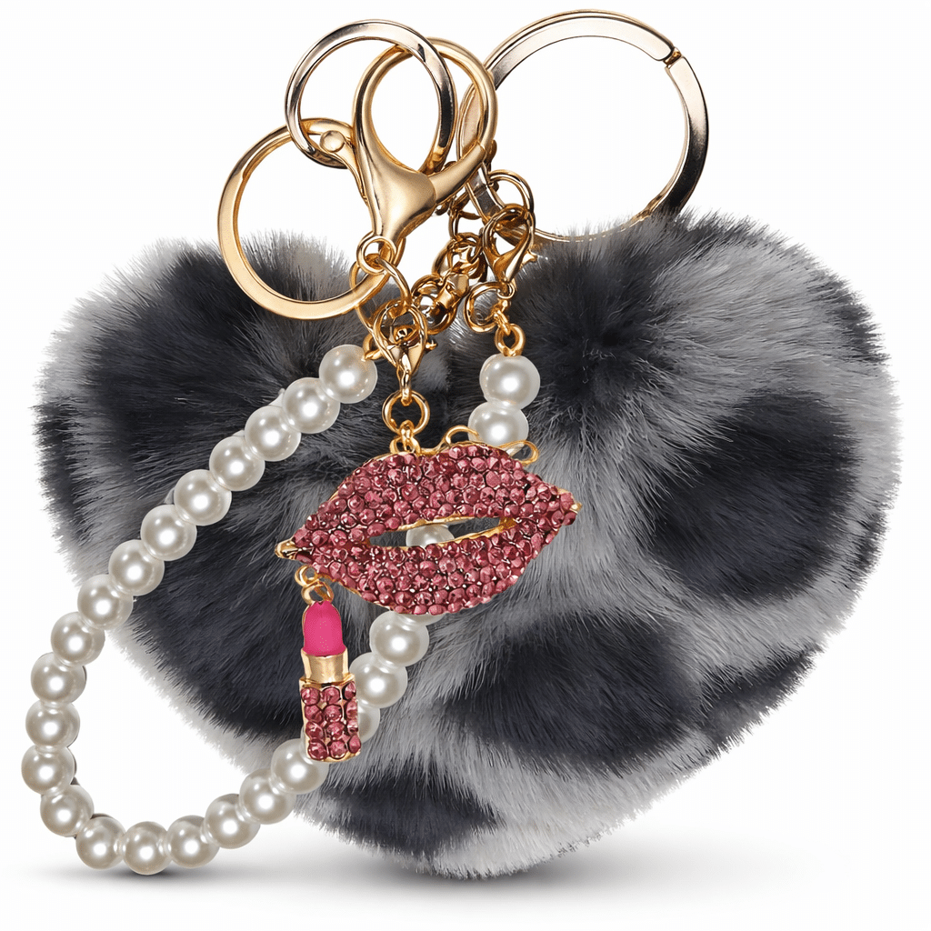 The **iAccessories Pearl Diamond Lips Fluffy Faux Fur Pom Pom Heart Key Ring – Grey Lepo** is a blend of elegance, sparkle, and cuteness.