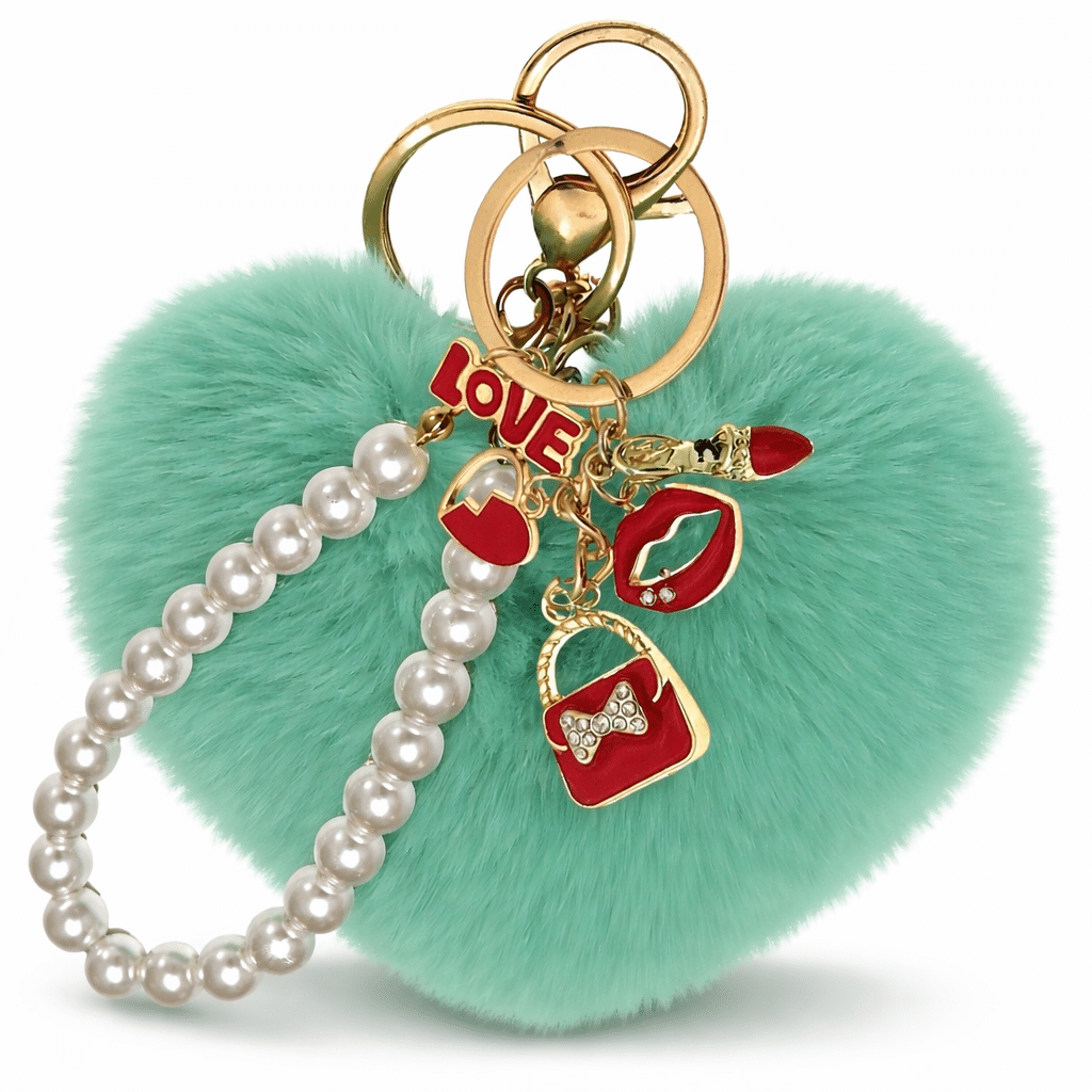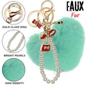 The **iAccessories Fluffy Faux Fur Pearl Fashion Pom Pom Heart Keychain Charm – Mint Green** is a beautiful mix of cuteness and elegance.