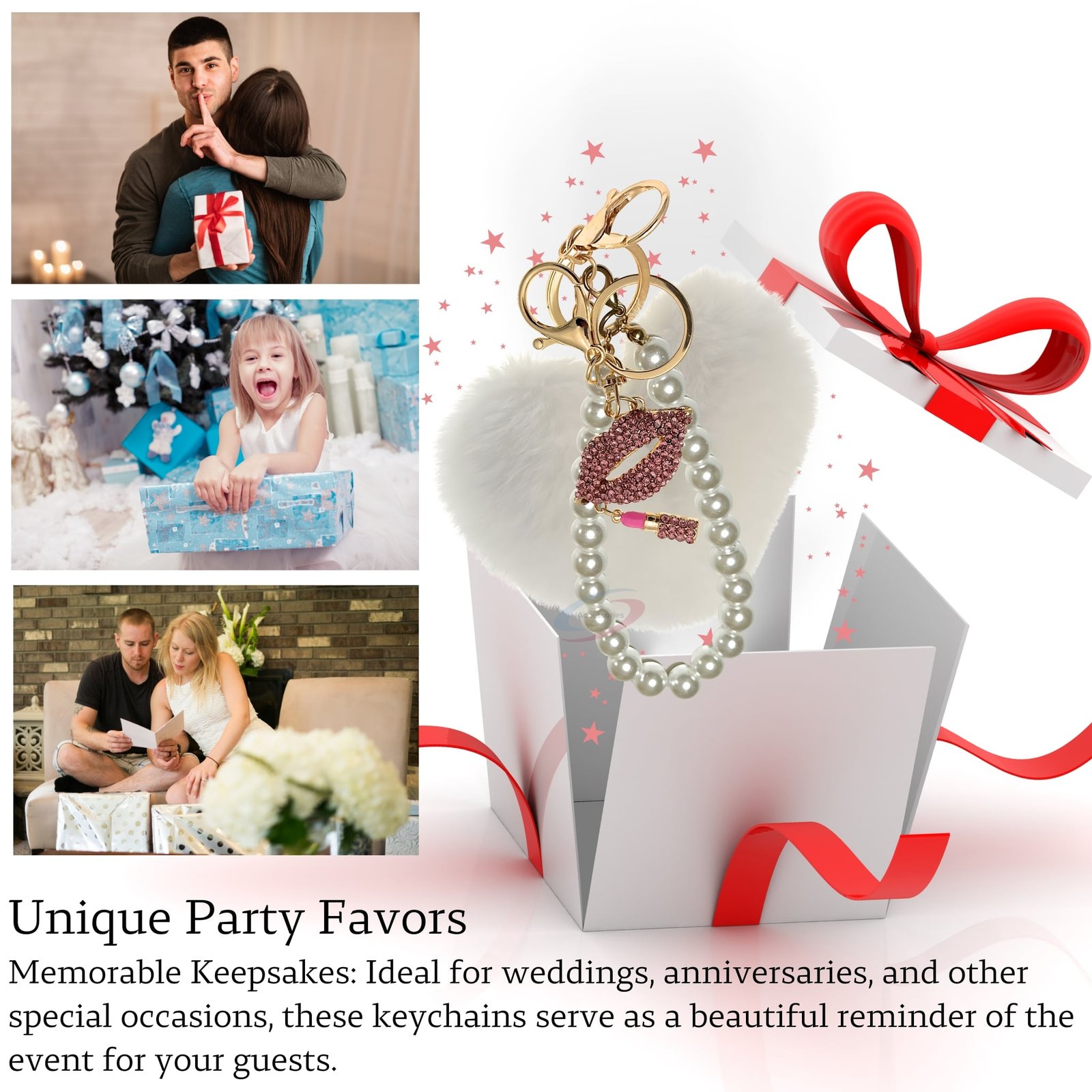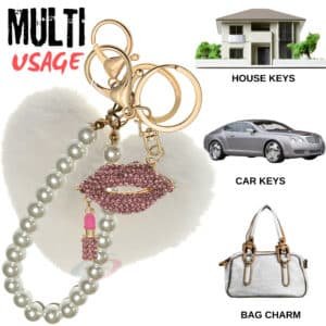 This fashionable keychain features a plush faux fur heart, a glossy pearl pendant, and sparkling diamond-studded lips. It's the ultimate statement piece, designed to give your bags and keys a fashionable, trendy, and high-end upgrade.