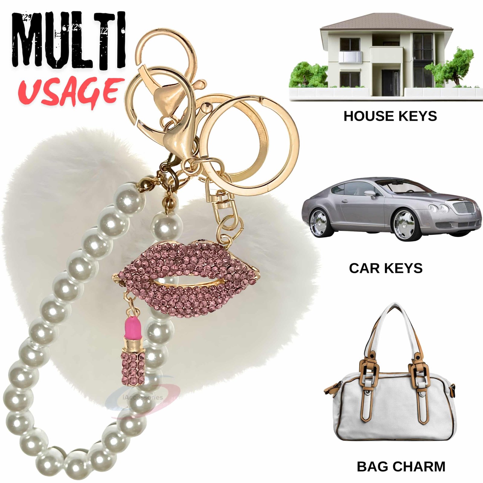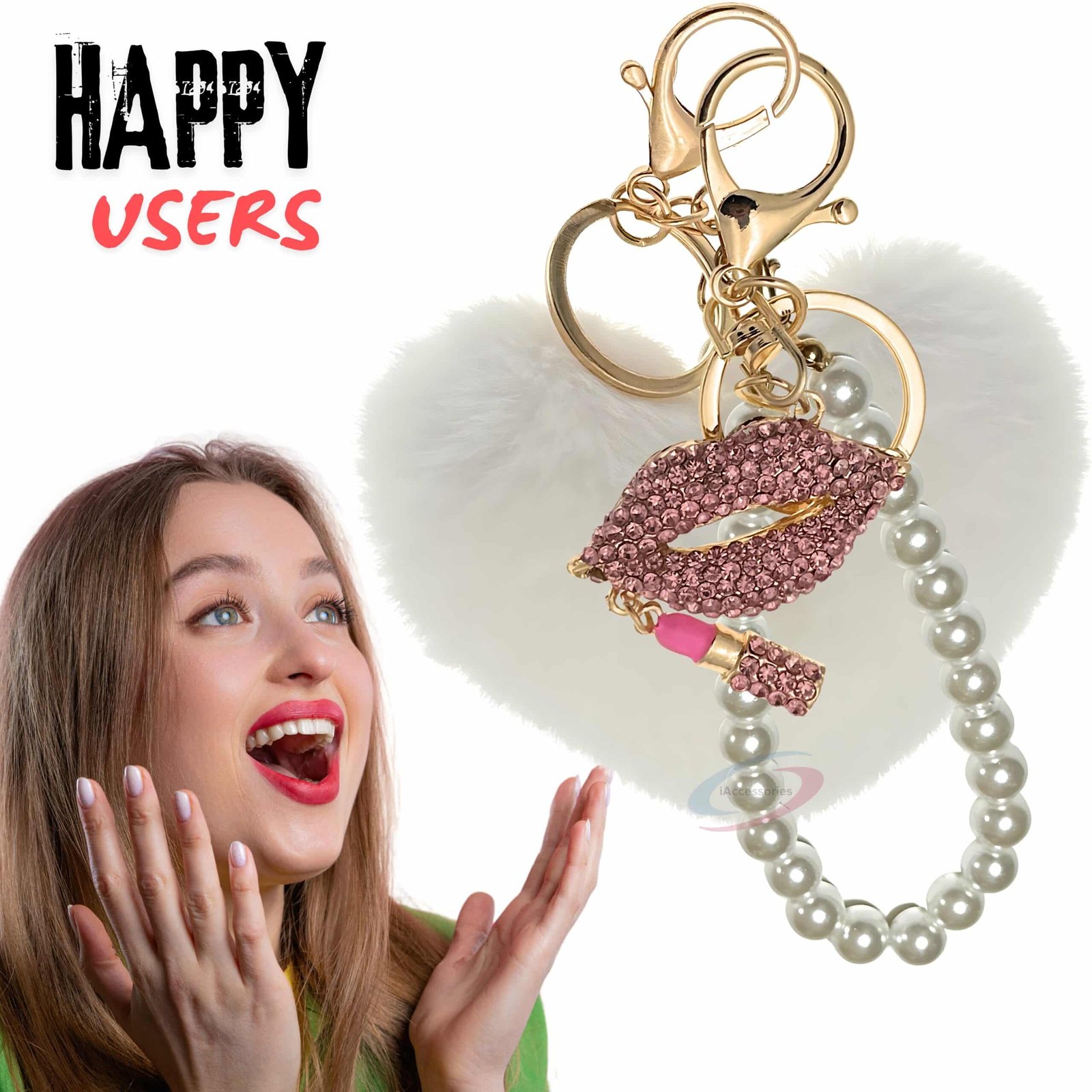 The **iAccessories Pearl Diamond Lips Fluffy Faux Fur Pom Pom Heart Key Ring** is a blend of elegance, sparkle, and cuteness.