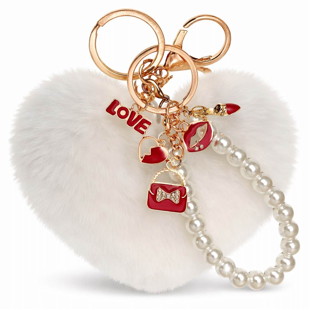 The **iAccessories Fluffy Faux Fur Pearl Fashion Pom Pom Heart Keychain Charm – White** is a beautiful mix of cuteness and elegance.