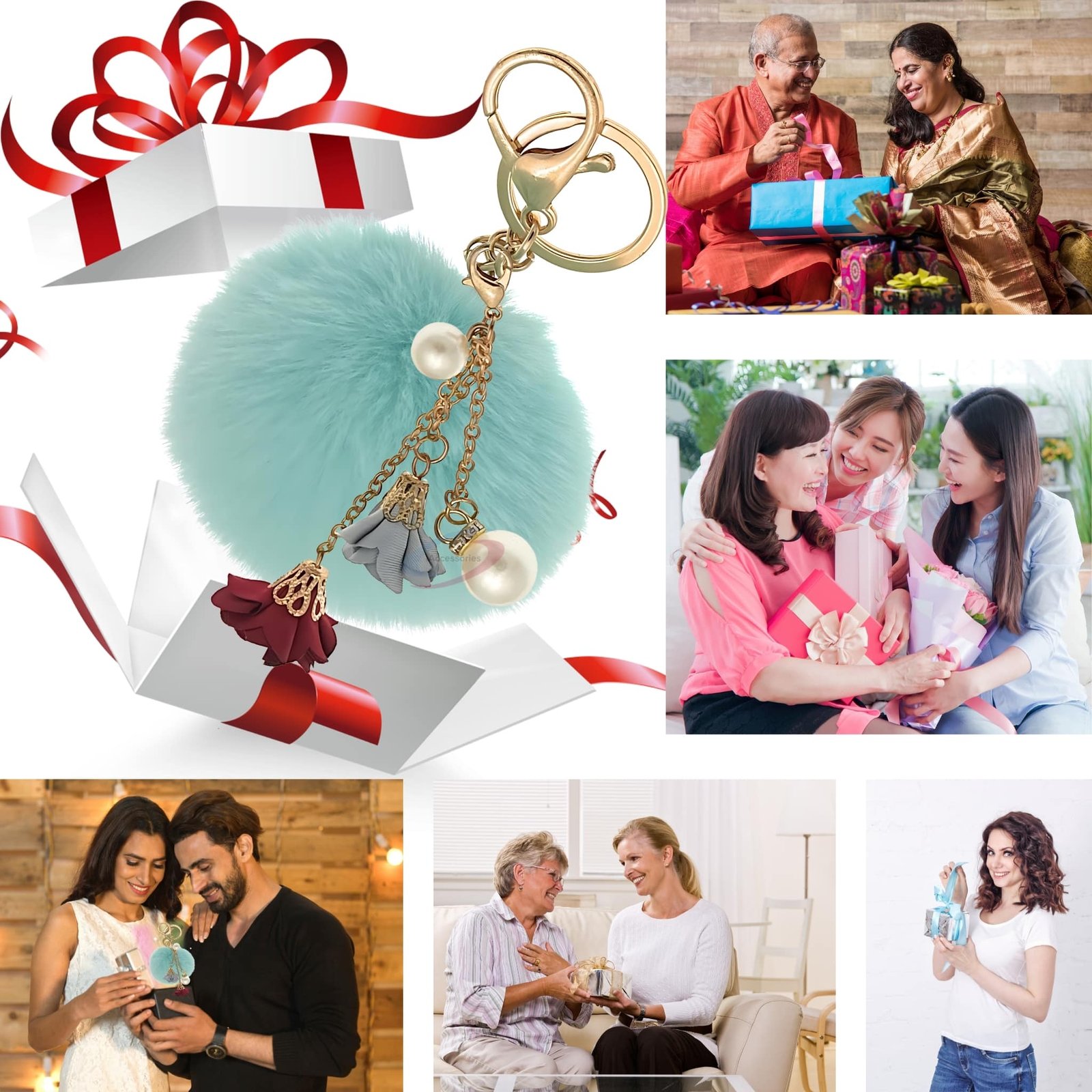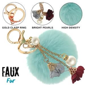 Elevate your style with this fluffy faux fur key ring. Featuring elegant pearls and charming roses in a refreshing Mint Green shade.