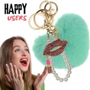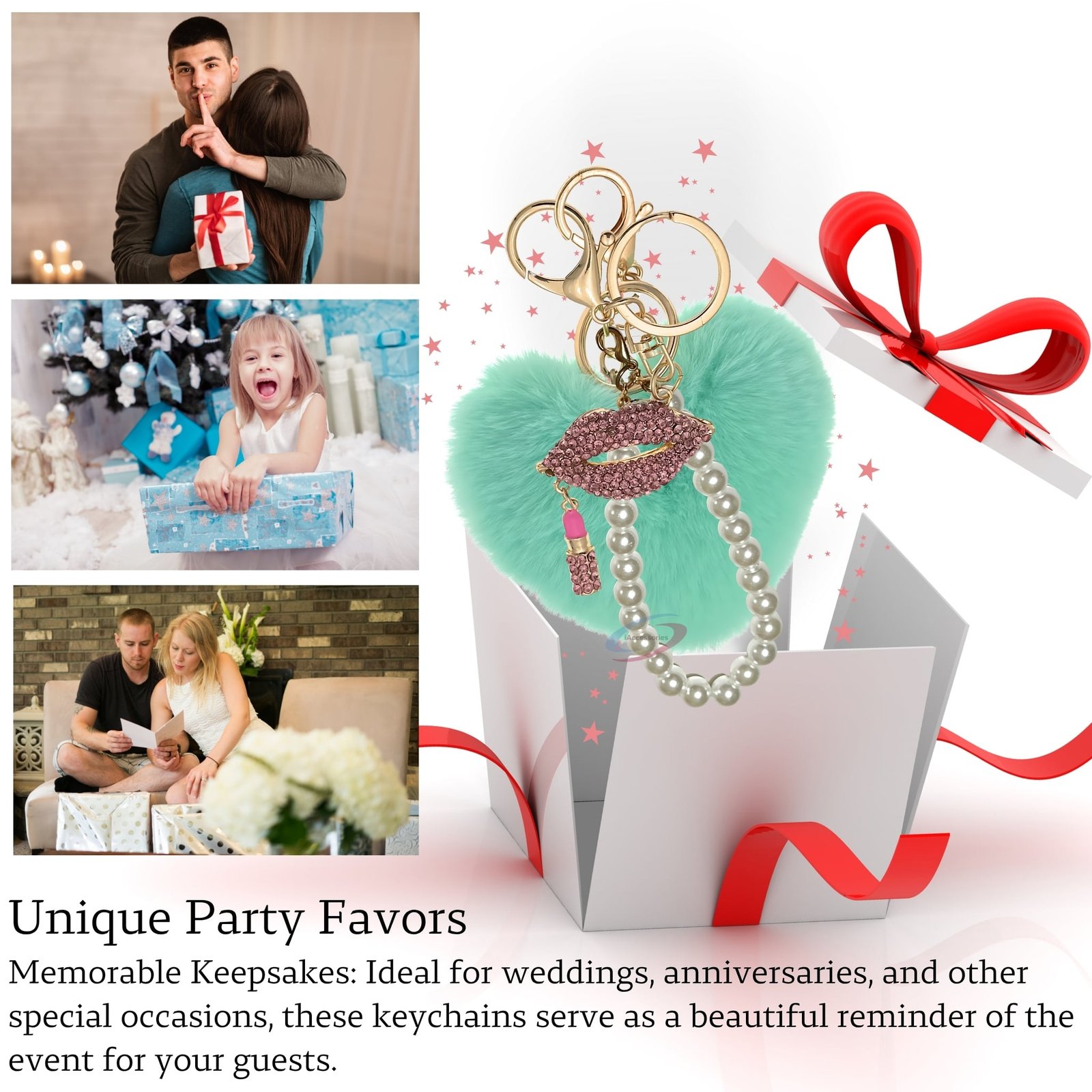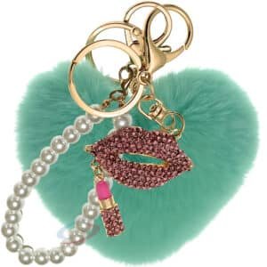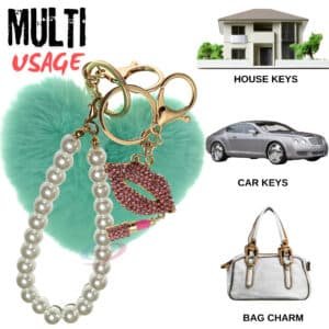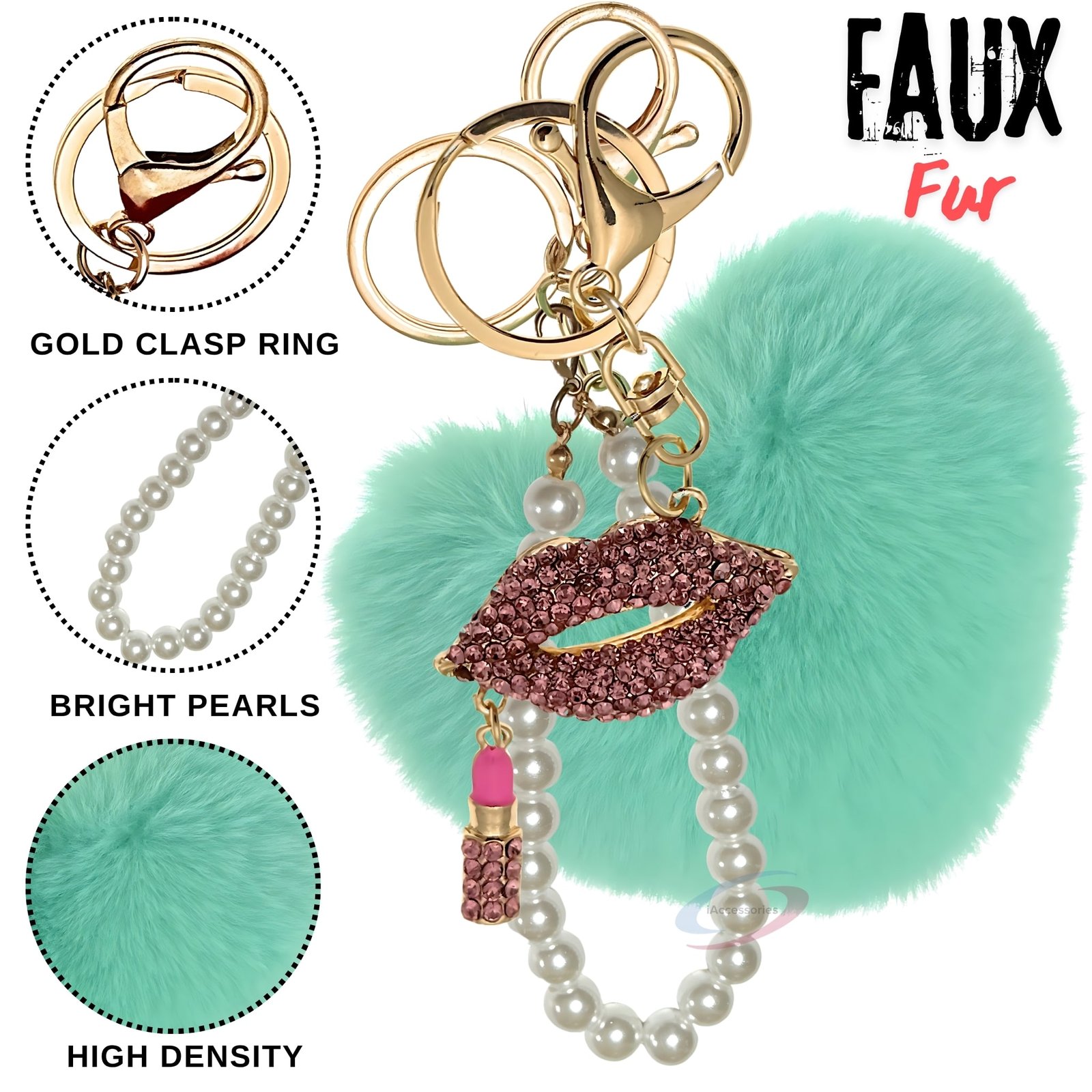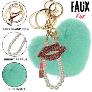 The **iAccessories Pearl Diamond Lips Fluffy Faux Fur Pom Pom Heart Key Ring – Mint Green** is a blend of elegance, sparkle, and cuteness.