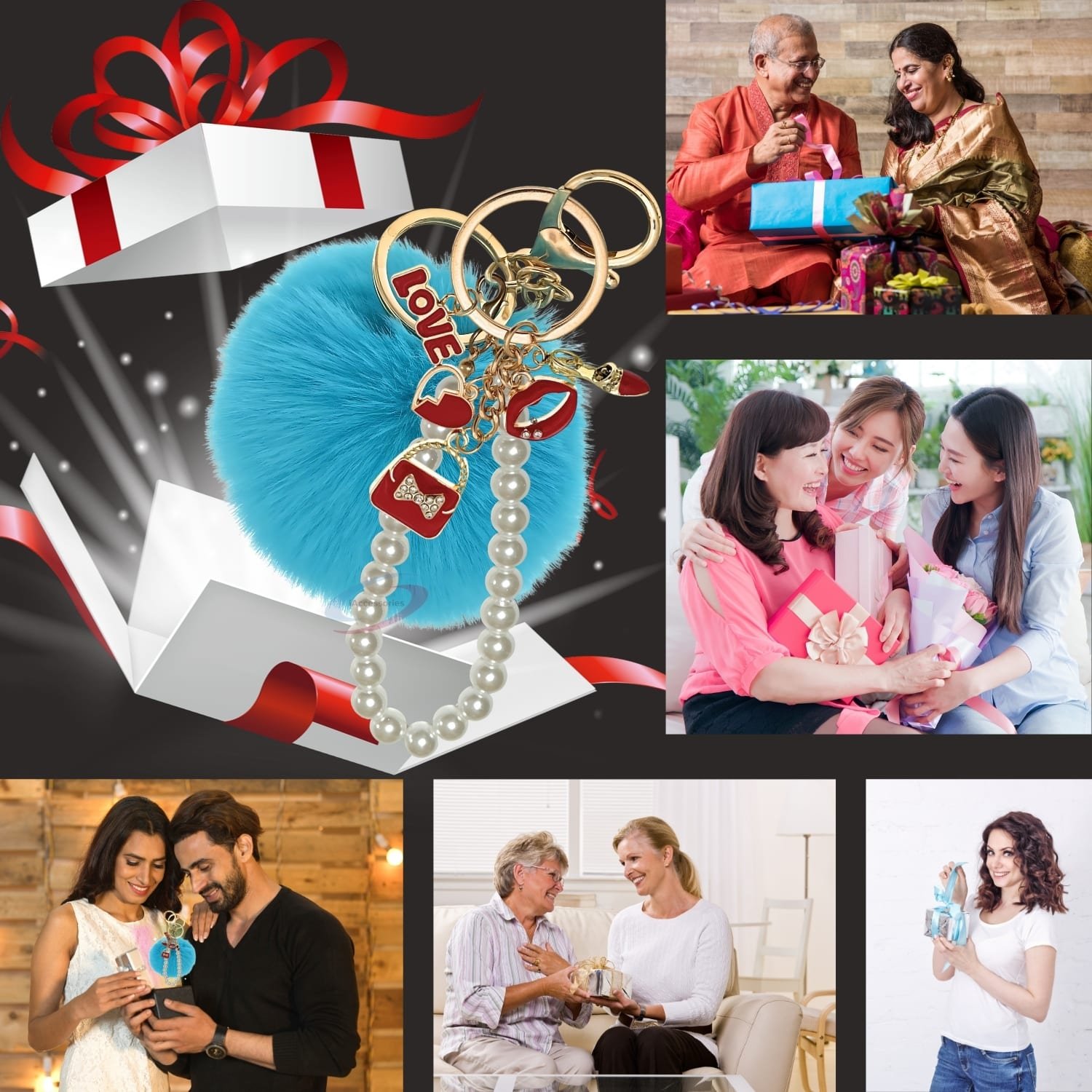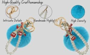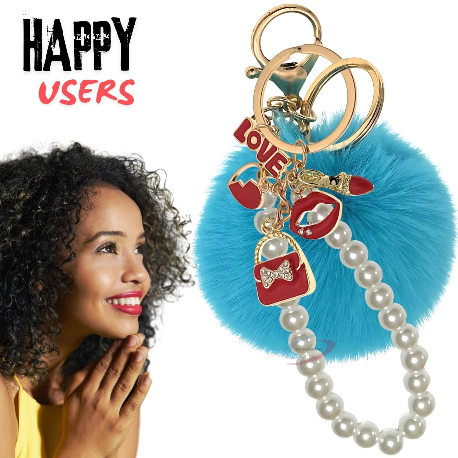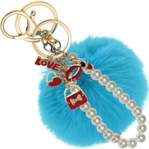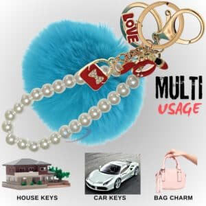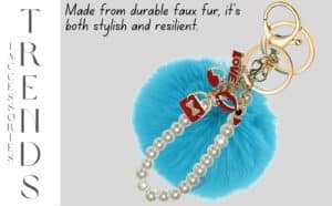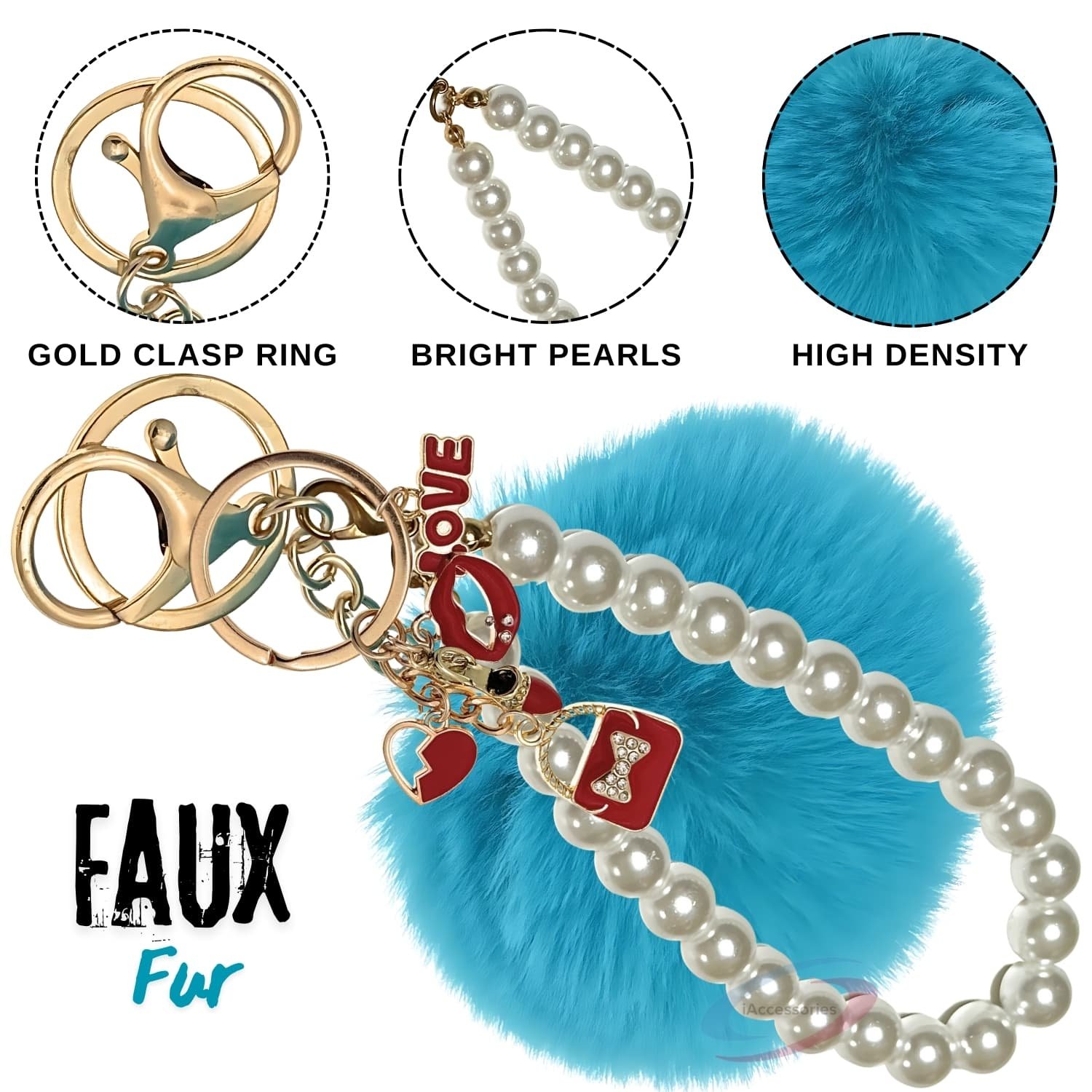 Upgrade your accessories with the bold and trendy iAccessories Fluffy Faux Fur Pearl Pom Pom Keychain – Peacock Blue.