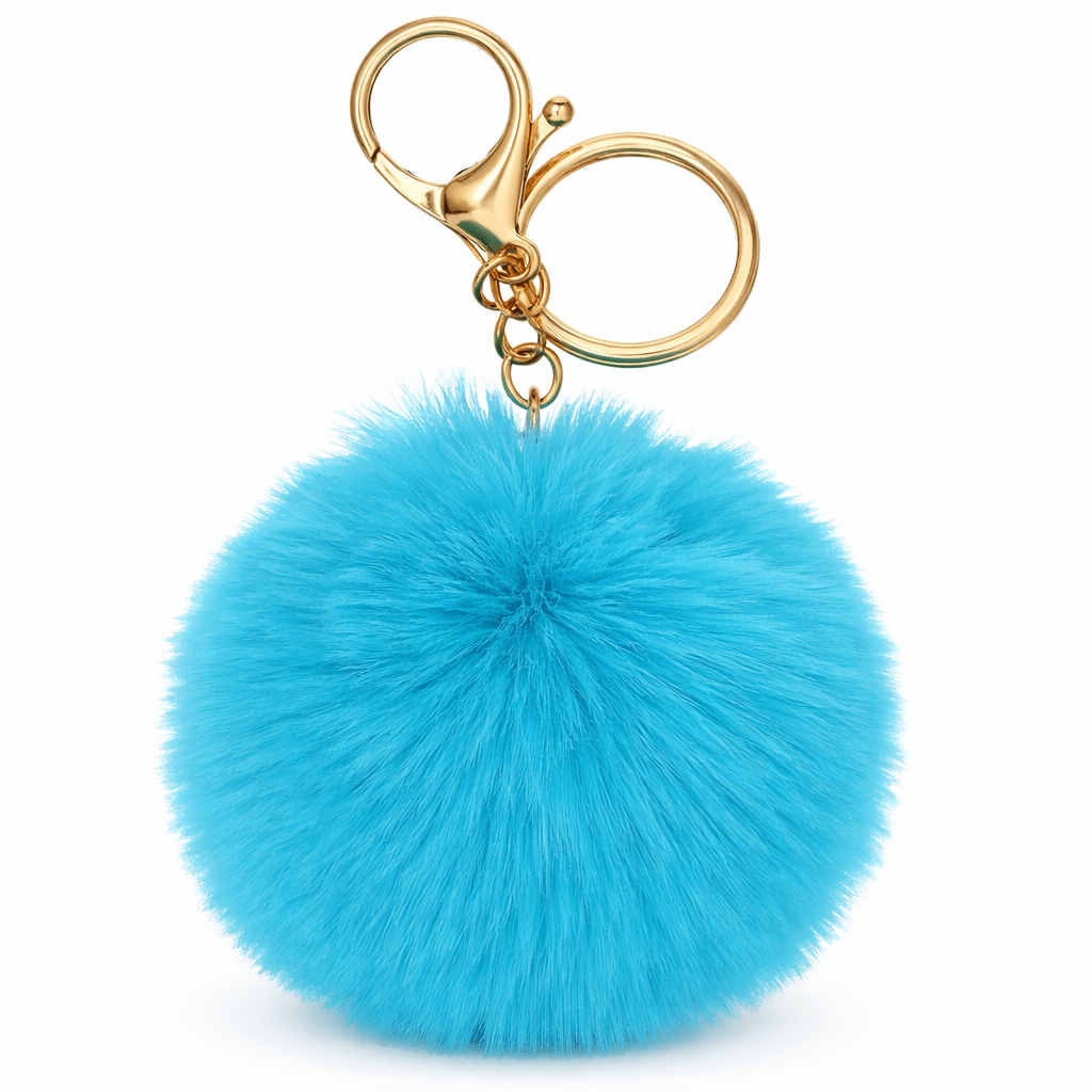 Brighten your everyday look with the iAccessories Fluffy Faux Fur Pom Pom Ball Key Ring – Peacock Blue.