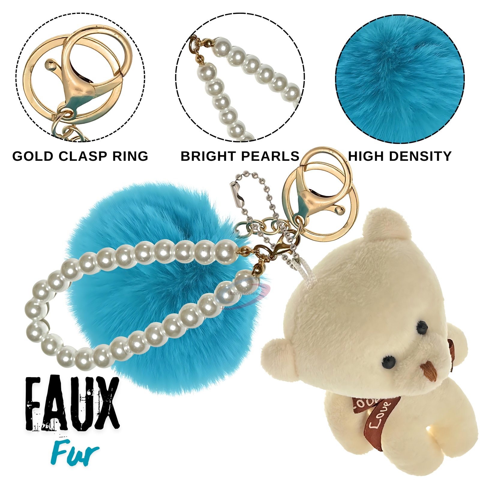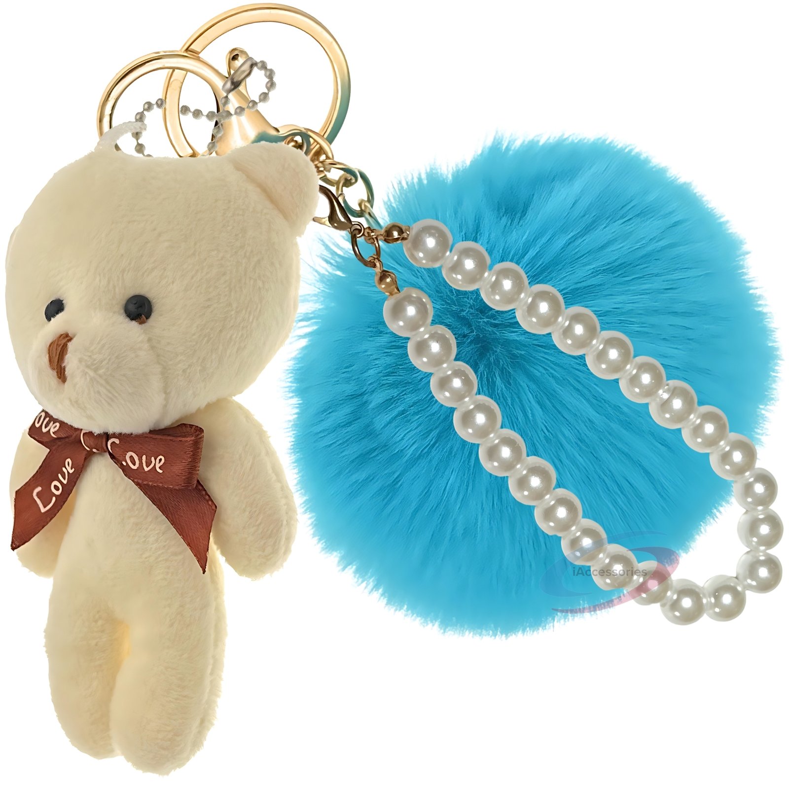 Upgrade your style with the adorable iAccessories Fluffy Faux Fur Pearl Teddy Pom Pom Key Ring – Peacock Blue-White.