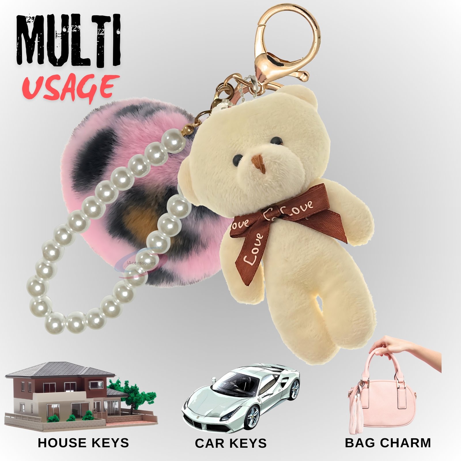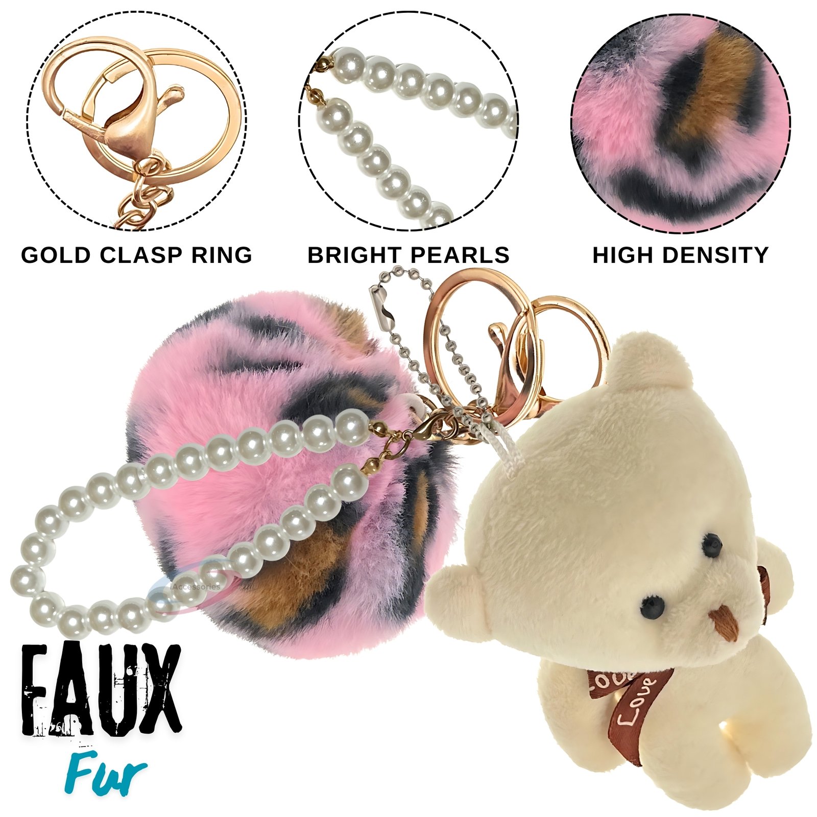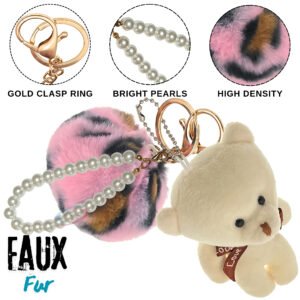Give your bag a cute and trendy makeover with the iAccessories Fluffy Faux Fur Pearl Teddy Pom Pom Key Ring – Pink Leopard-White.