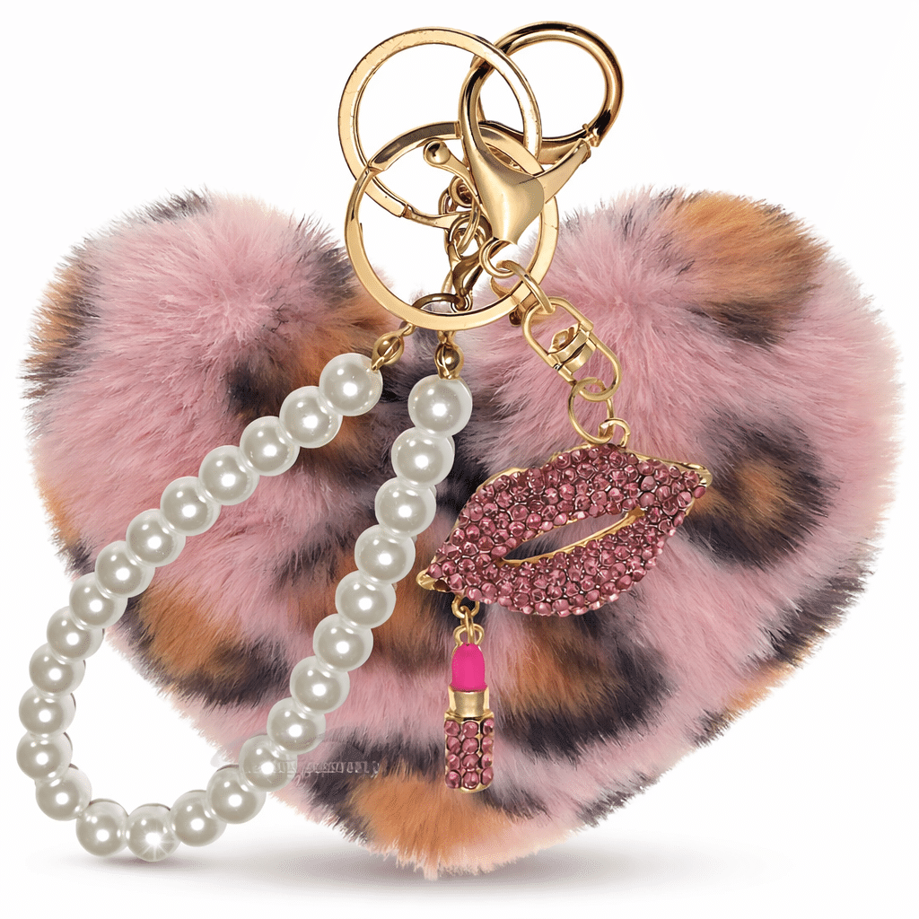 The **iAccessories Pearl Diamond Lips Fluffy Faux Fur Pom Pom Heart Key Ring – Pink Lepo** is a blend of elegance, sparkle, and cuteness.