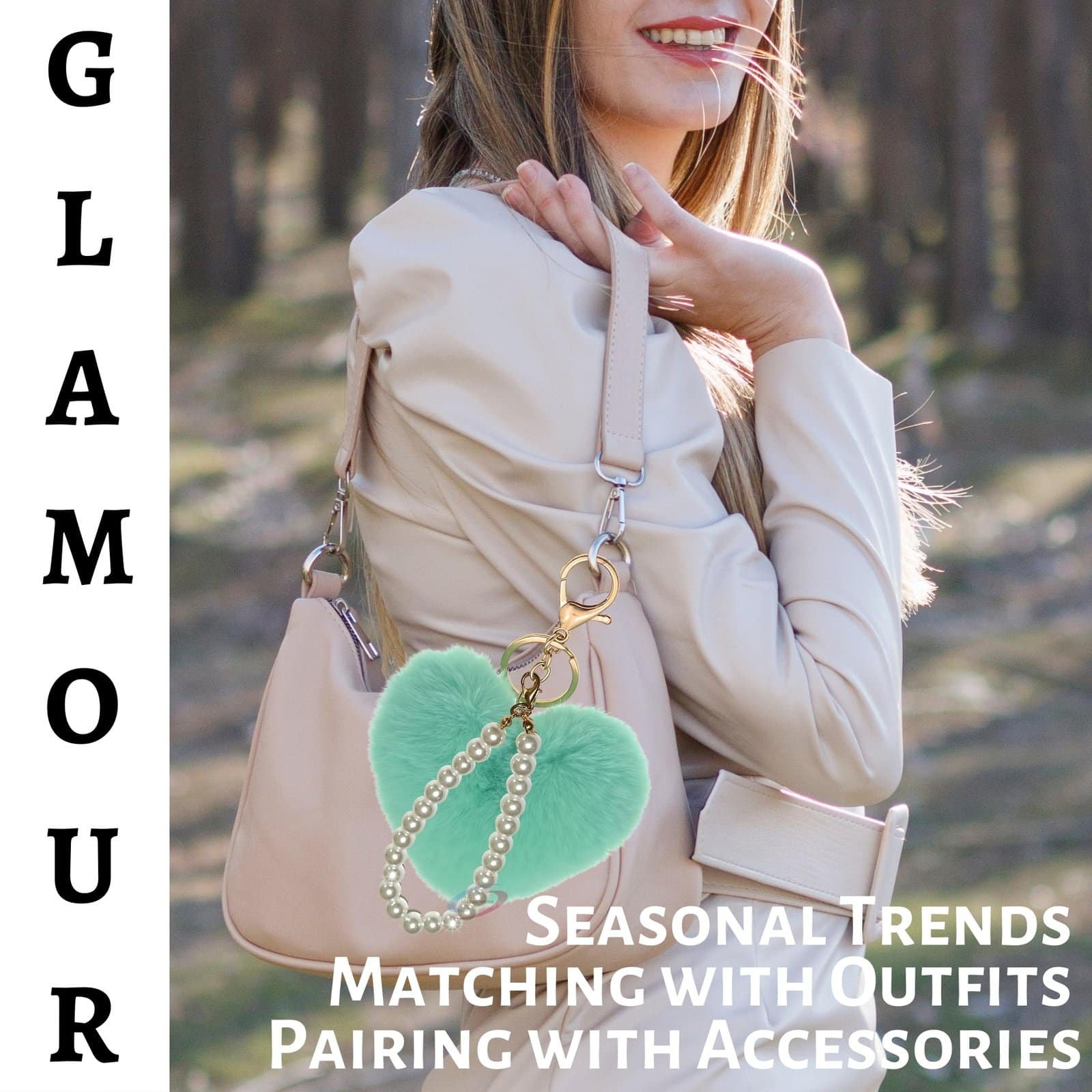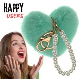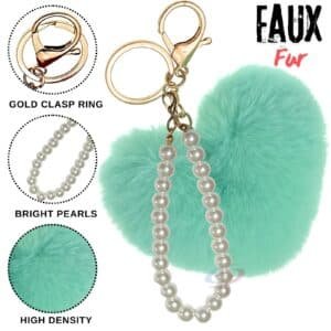 The fashionable heart-shaped faux fur pompom in refreshing mint green, coupled with an elegant **pearls pendant**, adds a stylish and romantic touch to your accessories.