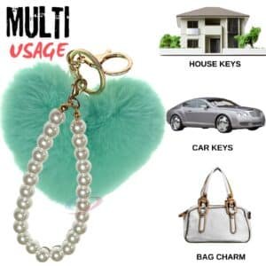 This is more than just a keychain; it's a luxurious statement piece. Crafted with **ultra-soft faux fur** in a charming mint green hue and complemented by a chic **pearls pendant**, it’s the perfect blend of high fashion and everyday function. Ideal for accessorizing your bags, purses, wallets, cars, bikes, scooty, and home keys.