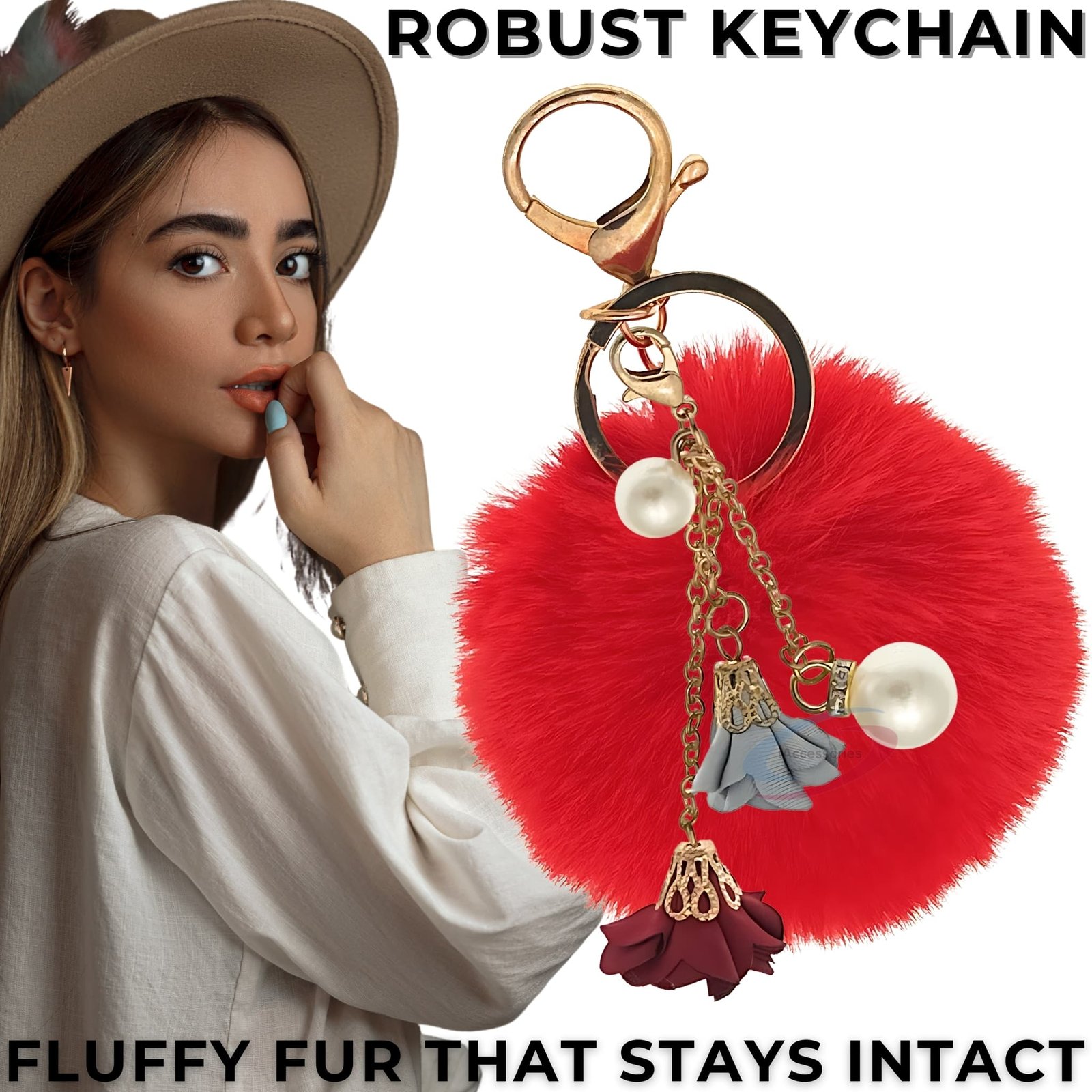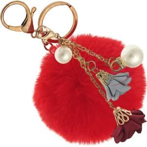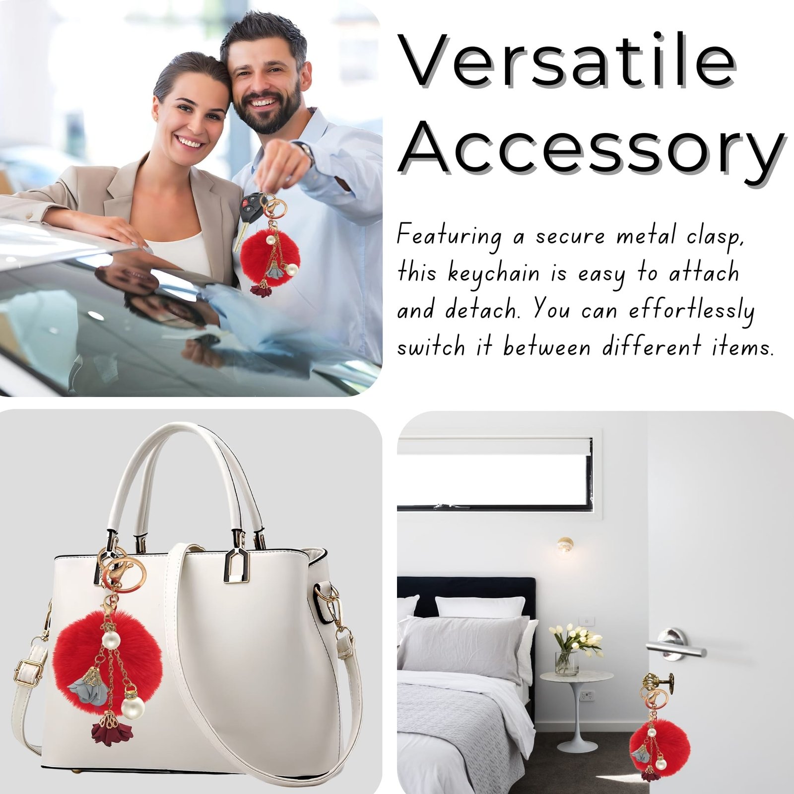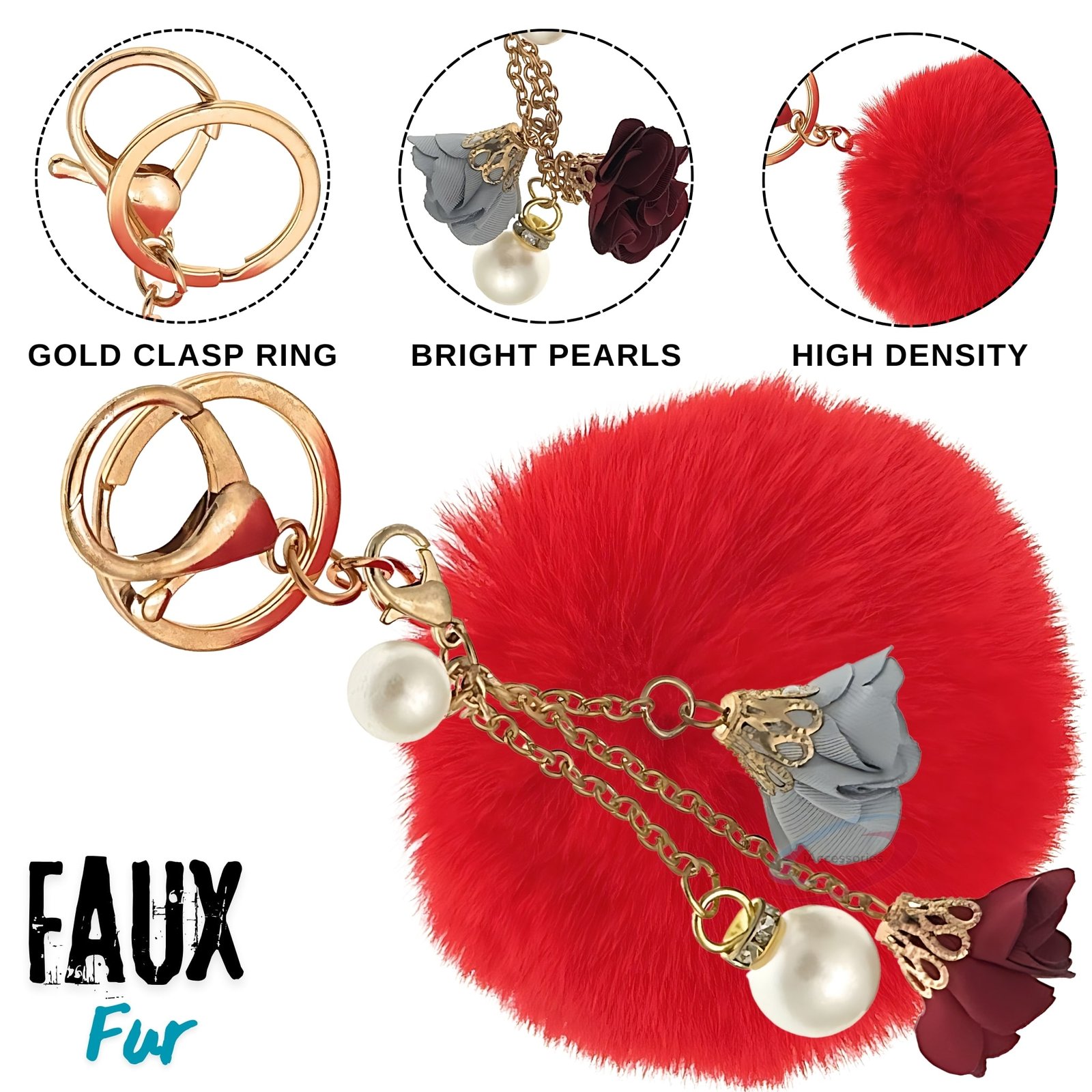 Turn your accessories into a style statement. A bold fluffy pom pom with pearl decorations and a sweet rose charm for an elegant flair.