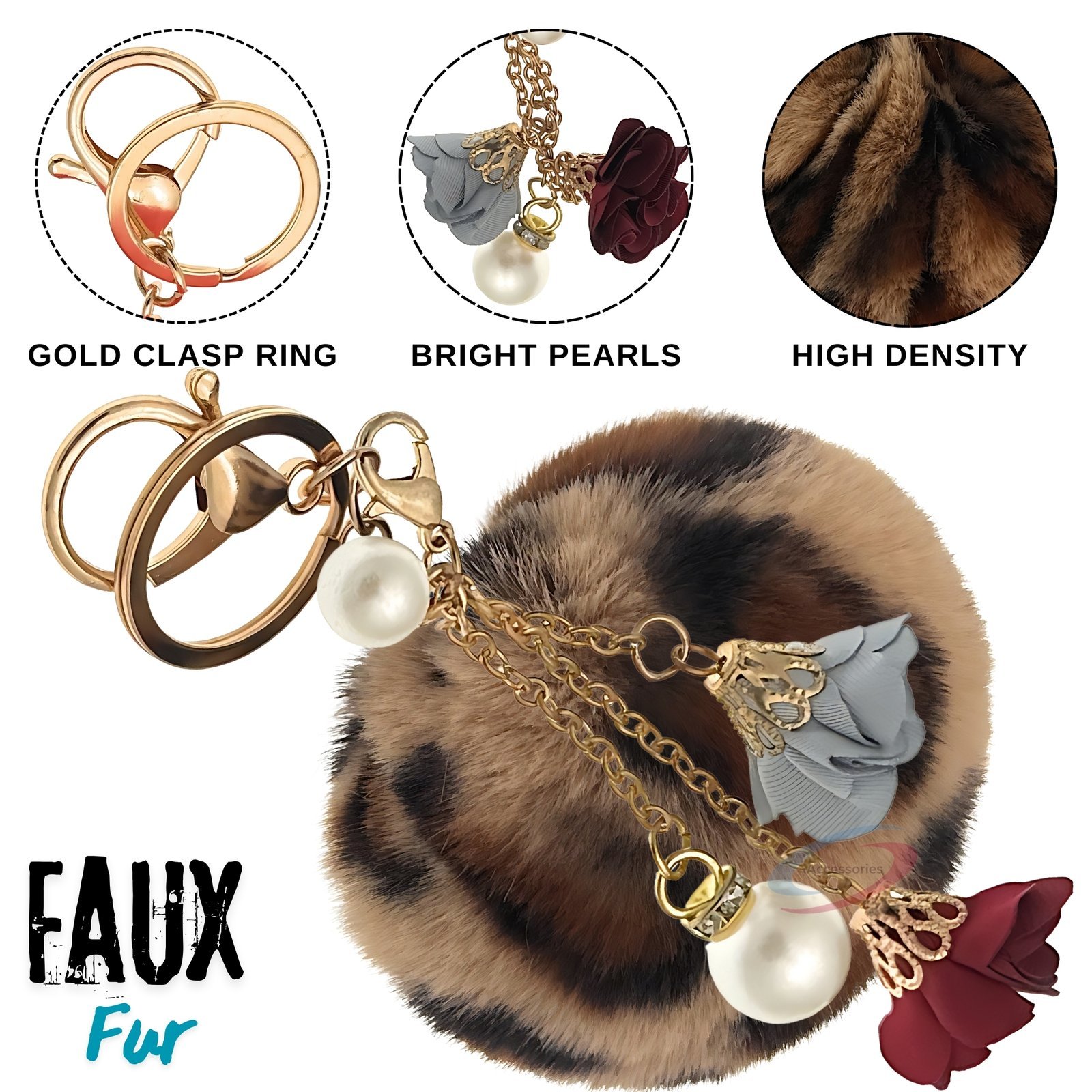 iAccessories Faux Fur Pom Pom Ball with Twin Roses & Pearls