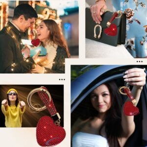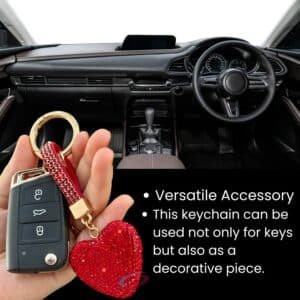 View 1: Main product view View 2: Dazzling red crystal heart design View 3: Keychain shown as a versatile bag accessory View 4: Premium quality sparkling red crystals View 5: Durable and high-quality metal clasp View 6: Helps keep keys organized with style View 7: Keychain as a perfect gift idea