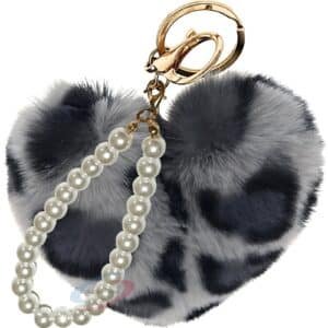 The fashionable heart-shaped faux fur pompom in Grey Lepo, coupled with an elegant **pearls pendant**, adds a stylish and romantic touch to your accessories.