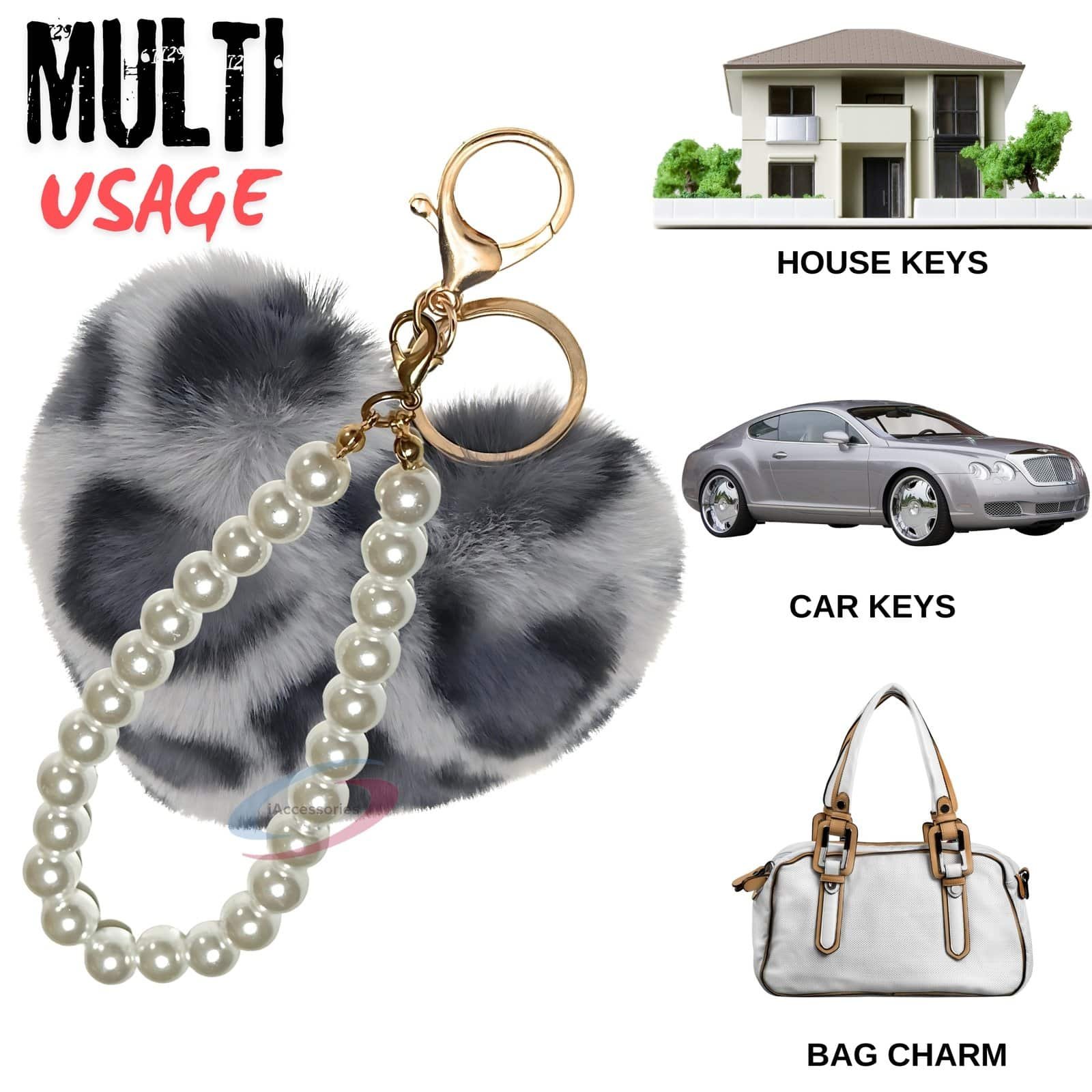 This is more than just a keychain; it's a luxurious statement piece. Crafted with **ultra-soft faux fur** in a subtle grey leopard hue and complemented by a chic **pearls pendant**, it’s the perfect blend of high fashion and everyday function. Ideal for accessorizing your bags, purses, wallets, cars, bikes, scooty, and home keys.