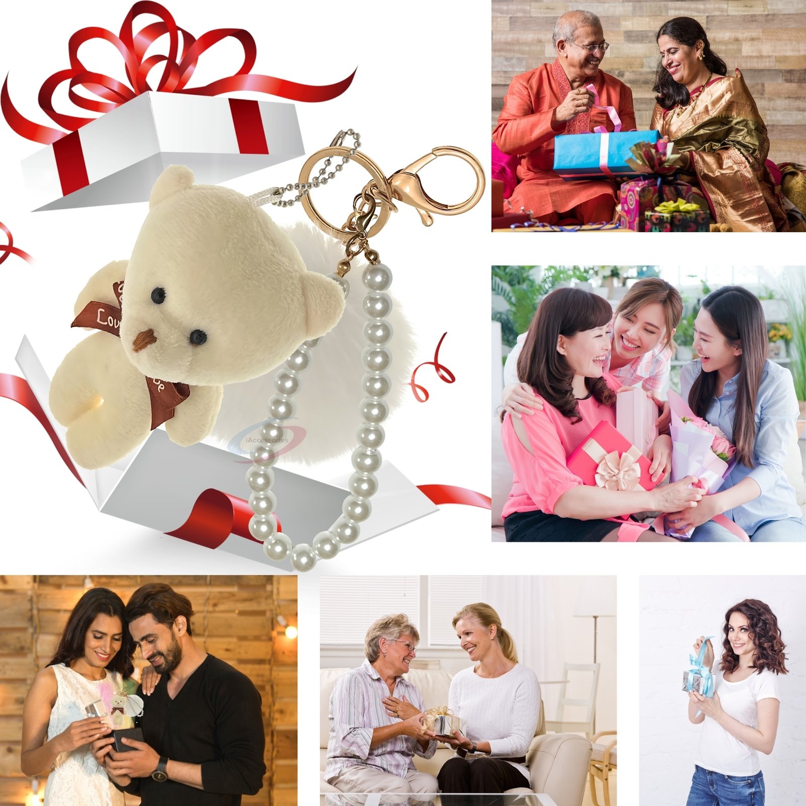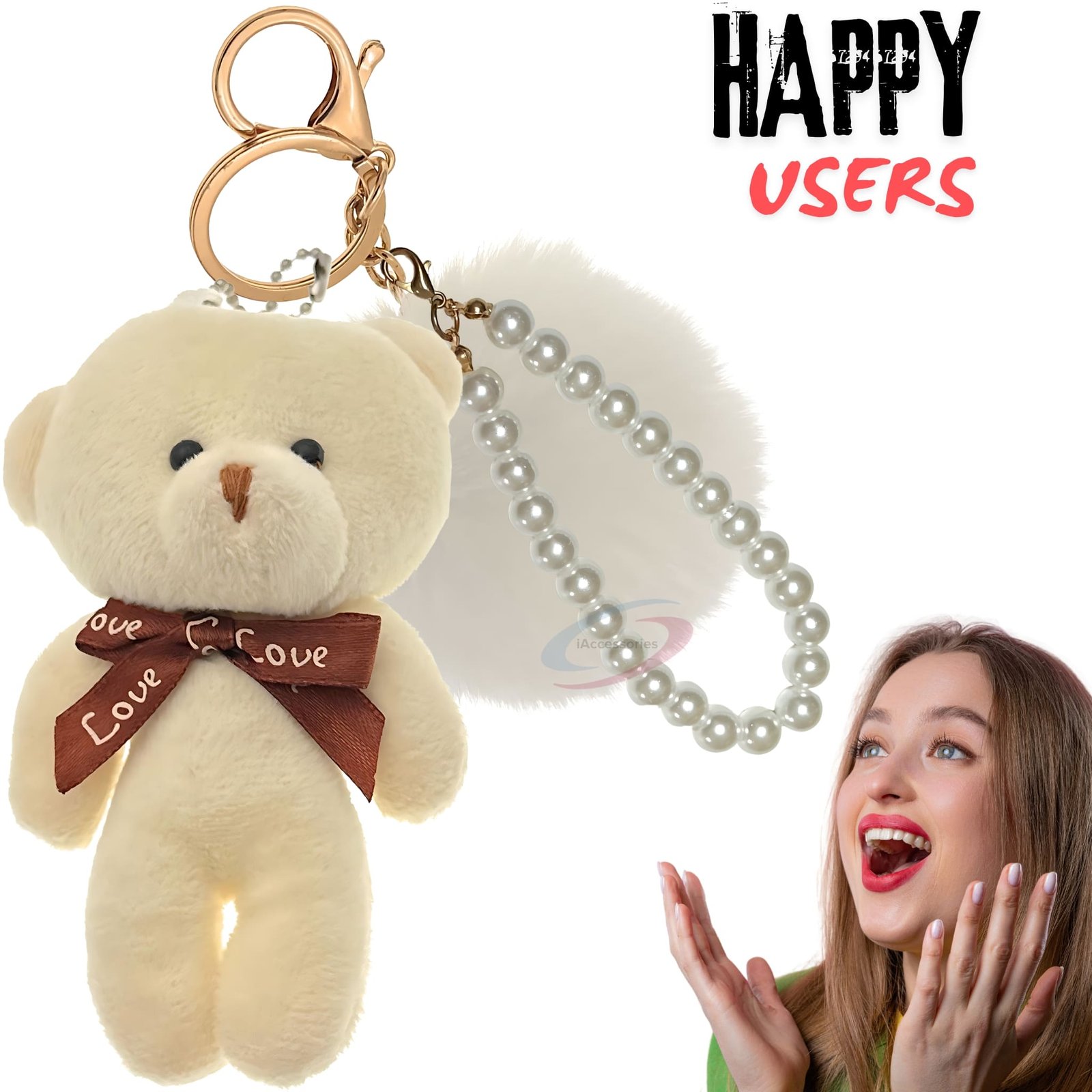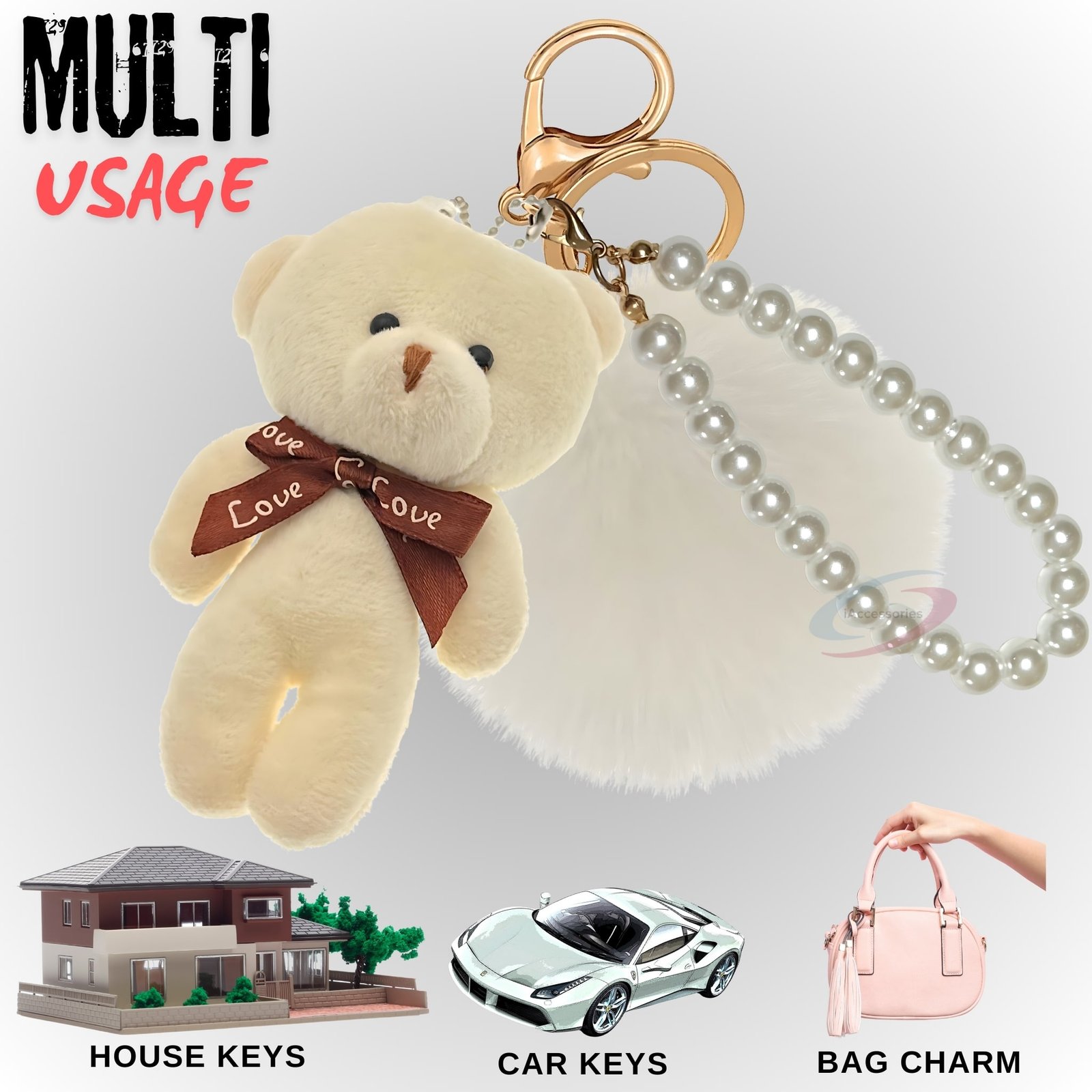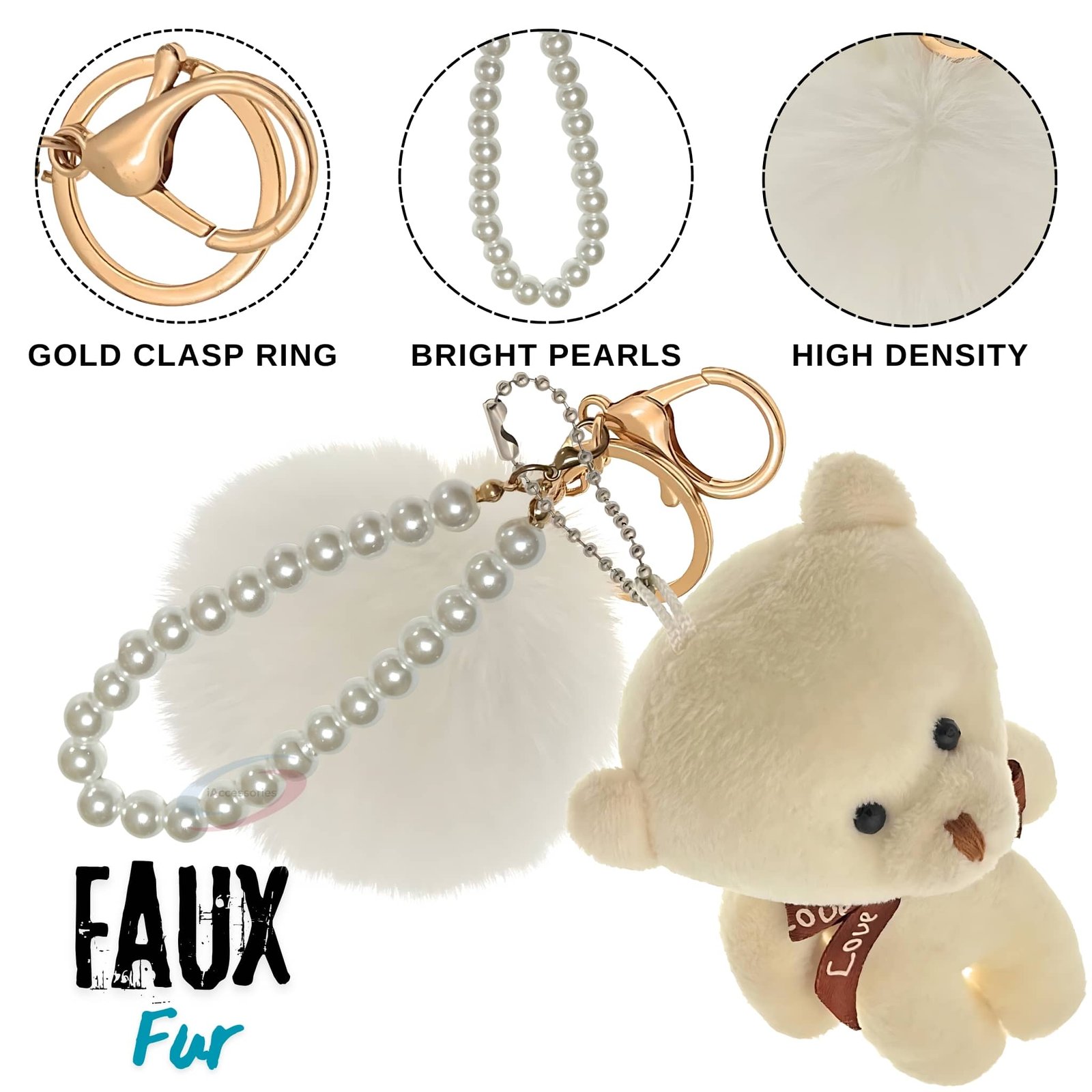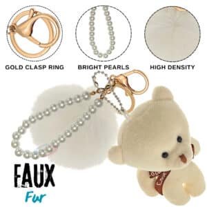 White Teddy Faux Fur Pom Pom Key Ring – iAccessories Pearl Bag Charm for Girls