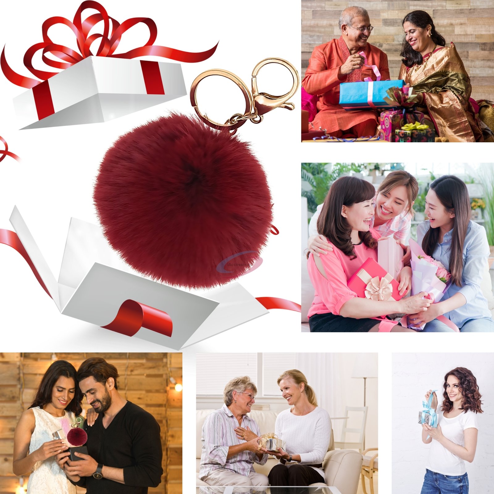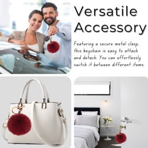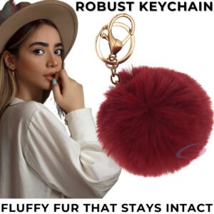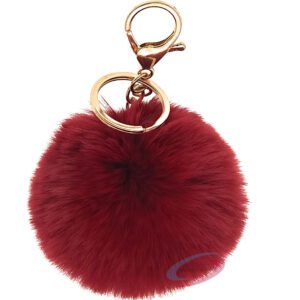 Elegant Wine Red fluffy faux fur pom pom ball key ring—perfect for adding a classy touch to girls’ handbags, keys, backpacks, wallets and luggage.
